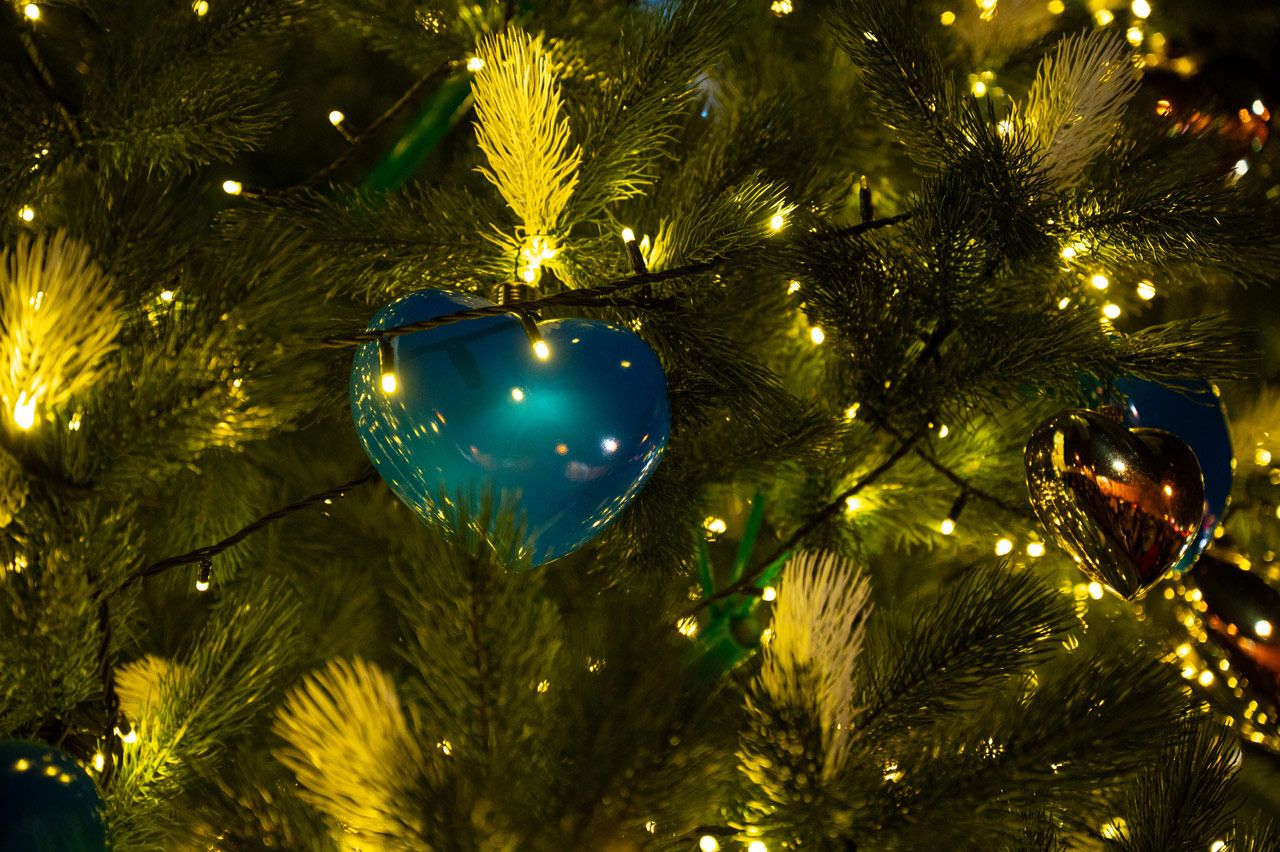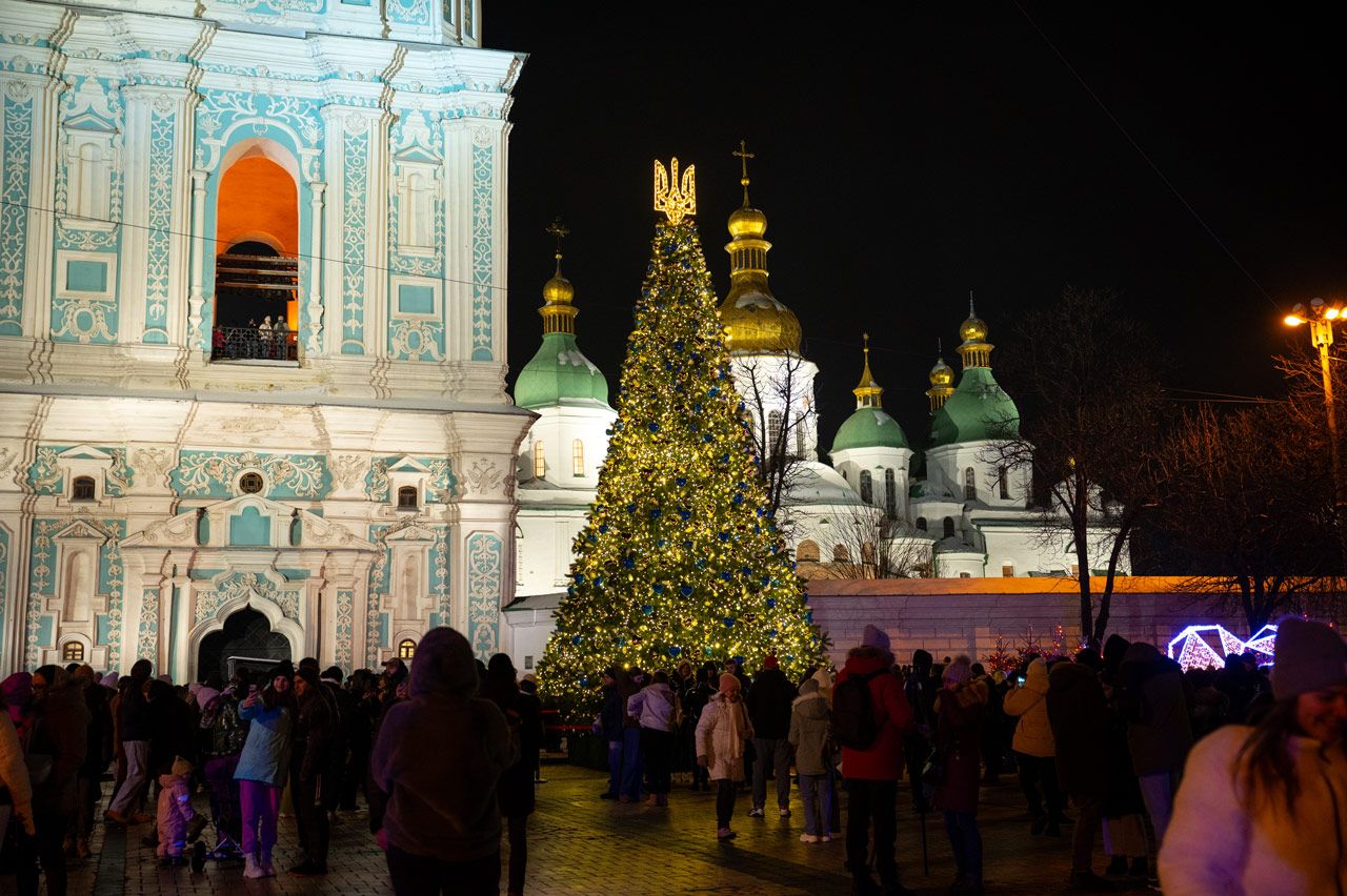 На Софийской площади в Киеве 6 декабря, в День святого Николая, прошла церемония, на которой зажгли главную новогоднюю елку Украины. Тематика новогодней елки — «Храбрые сердца», посвященная украинским военным, поэтому елка украшена игрушками в форме синих и желтых сердец. Каждый желающий может снять игрушку, если перечислит деньги на ВСУ. До официального открытия елки, по сообщениям СМИ, киевляне и гости города сняли больше 500 игрушек-сердечек.
