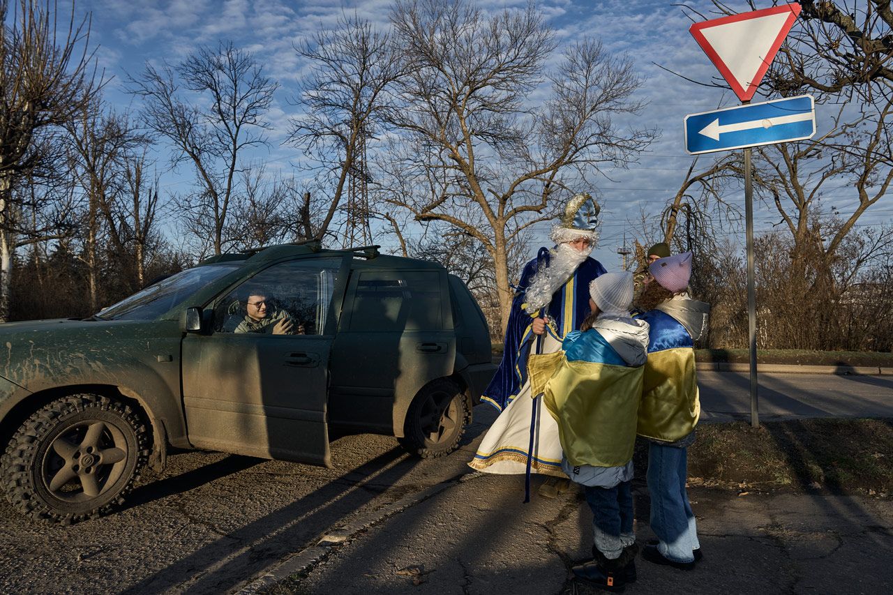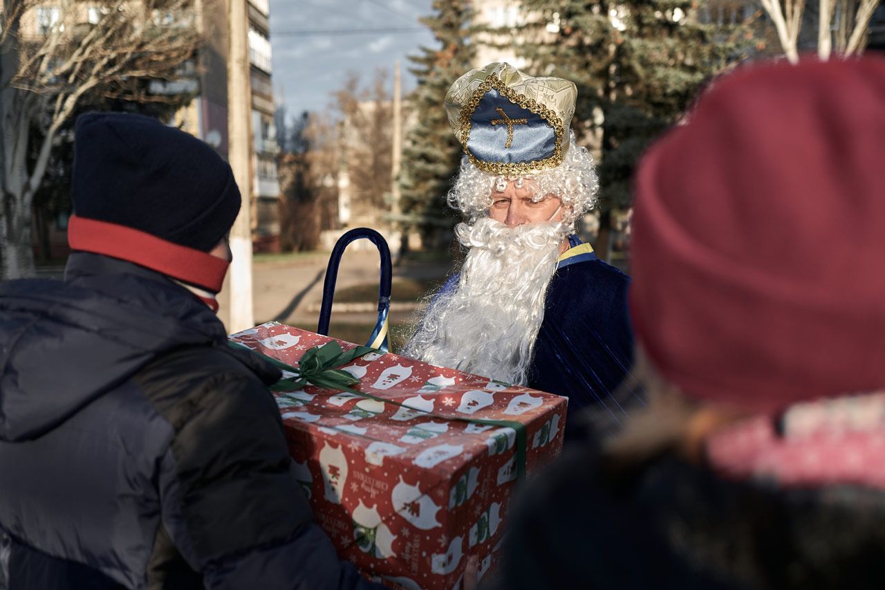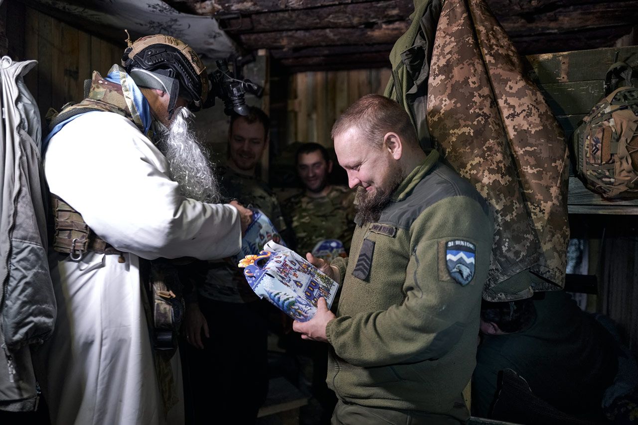 В Украине впервые после календарной реформы церкви отмечали День святого Николая 6 декабря (до реформы его отмечали 19 декабря). В этот день 10-я горно-штурмовая бригада ВСУ «Эдельвейс» организовала празднование для детей, живущих в прифронтовых районах, а также для украинских военных на боевых позициях, рассказали фотографы Костя и Влада Либеровы.