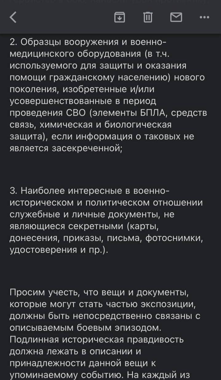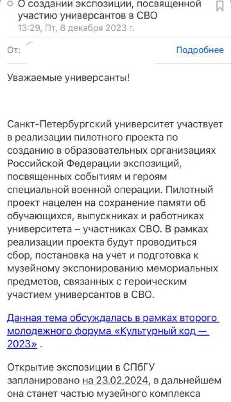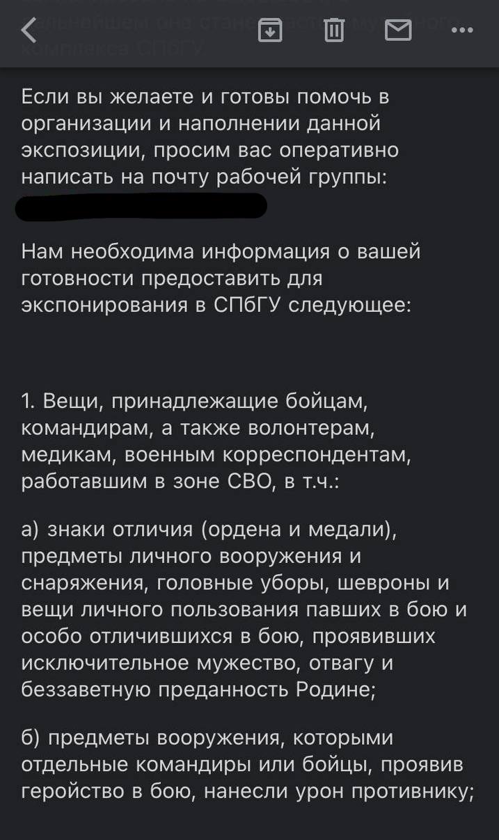 В СПбГУ планируют открыть экспозицию об универсантах, которые участвовали в войне в Украине. Собирать экспонаты вуз предложил студентам, выпускникам и сотрудникам. Письма об этом приходят на корпоративные почты в пятницу, 5 декабря. Об этом сообщили сами универсанты «Бумаге».
