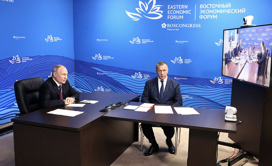 Перед ВЭФ Путин на вертолете отправился в приморский город Большой Камень — там на судостроительном комплексе «Звезда» давали имена новым танкерам. Сначала президент в сопровождении чиновников прошелся по совершенно пустым помещениям предприятия. А с наступлением полной темноты вышел на улицу — выступать перед работниками, которых еще засветло выстроили в шеренги. Но свежий приморский воздух и небольшое расстояние не показались Путину достаточной защитой — работников выстроили в более чем 10 метрах от Путина.