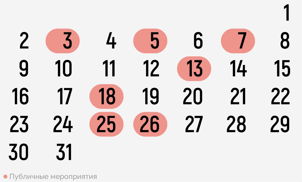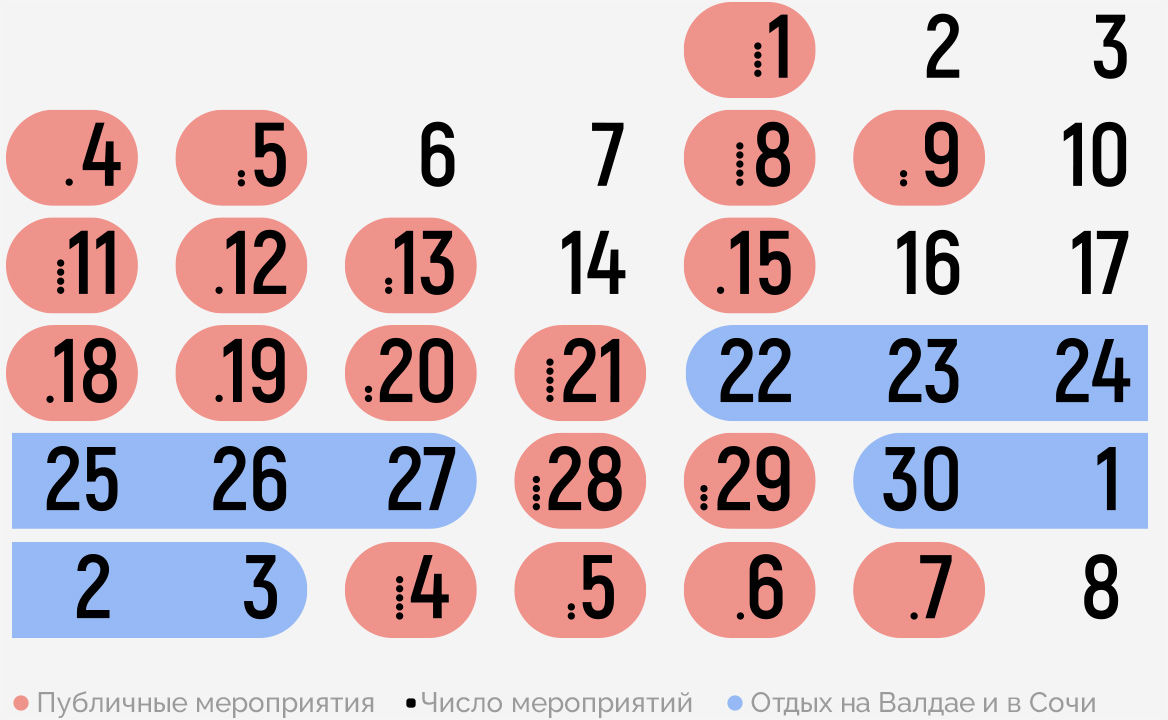 Правда, в некоторые месяцы говорить о чередовании не приходится — президент вообще пропадает. Например, в январе он был на публике всего семь дней. Рекорд президент поставил в декабре 2022 года, когда провел на публике 18 дней — по нынешним меркам это много.