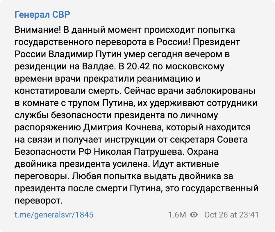 В конце октября политолог Валерий Соловей и связанный с ним telegram-канал «Генерал СВР» сообщили — Путин умер, его труп помещен в «морозильную камеру», а вместо настоящего президента весь мир наблюдает его двойника. На тяжелую болезнь главы государства Соловей намекает с 2016 года — тогда он предполагал скорую отставку Путина «из-за обстоятельств непреодолимой силы». Так что история о трупе в холодильнике вызвала в соцсетях в основном насмешки. Зато в существование у главы государства двойника верят многие.