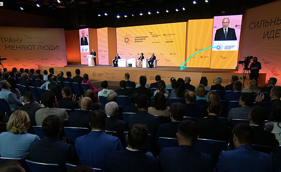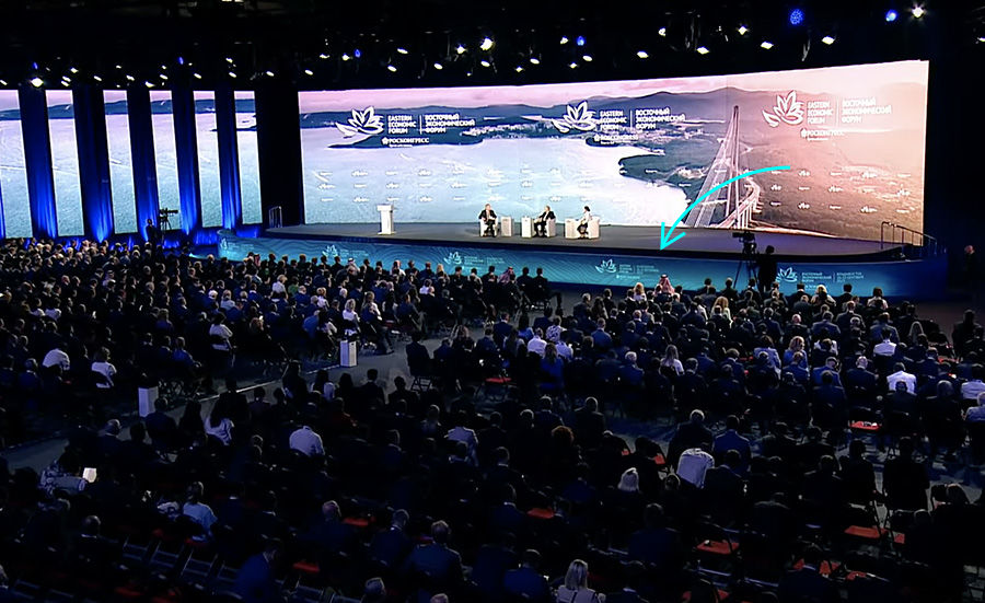 Но странности в той поездке не закончились. На следующий день президент отправился на остров Русский, где должен был посетить уже упомянутый форум ВЭФ, на котором он говорил про «возвращенцев». За несколько часов до этого мероприятия Путин, уже прилетев на остров, решил пообщаться с модераторами основных сессий. Но в одно помещение с президентом этих людей не пустили. Глава государства сел в небольшой комнате, где кроме него был лишь сопровождавший его всю поездку вице-премьер Юрий Трутнев, он курирует Дальний Восток и одновременно является полпредом в этом округе × , а также небольшой телевизор с камерой. Последний понадобился потому, что неудачливых модераторов сессий, сидящих в соседнем помещении, выводили для Путина по видеосвязи.