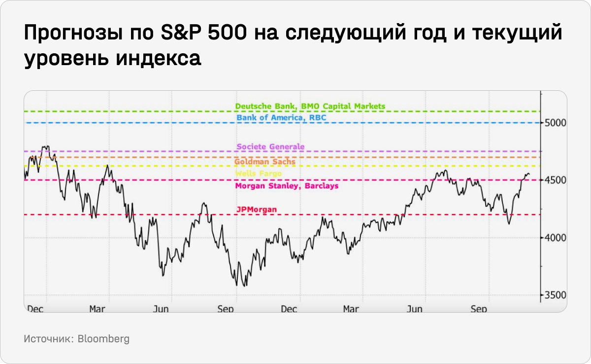 В четверг S&P 500 закрылся на отметке 4586 пунктов. Один из самых оптимистичных прогнозов (5000 пунктов) дают в Bank of America (BofA), отчет стратегов которого, как Morgan Stanley, есть у The Bell. Консенсус-прогноз предусматривает рост S&P 500 примерно на 3%.