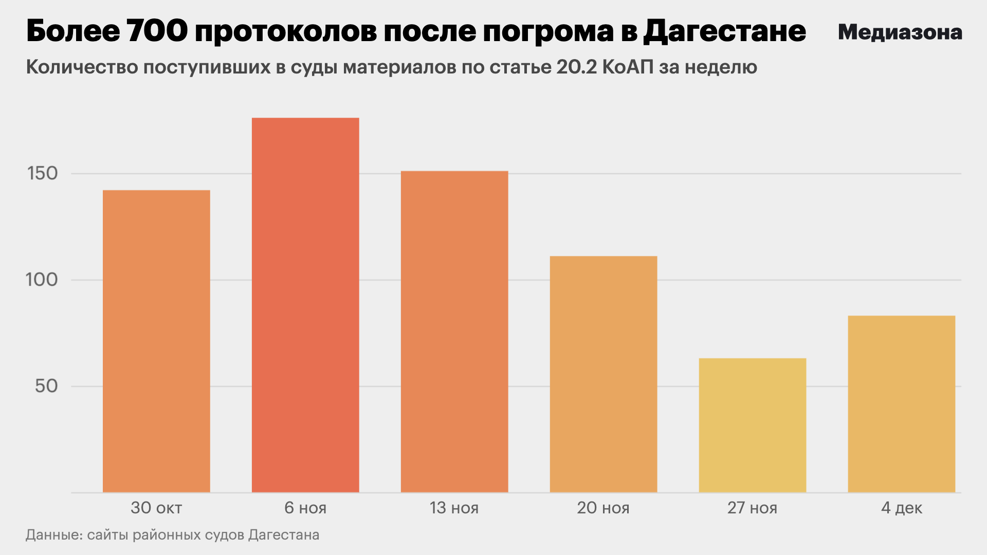 Помимо уголовного дела в Дагестане не прекращают оформлять новые протоколы в связи с погромом в аэропорту по статьям о нарушении правил проведения митингов (20.2 КоАП) и об организации массового одновременного пребывания граждан (20.2.2 КоАП). По итогам первой недели декабря, как выяснила «Медиазона», в районные суды поступили протоколы против 741 человека.