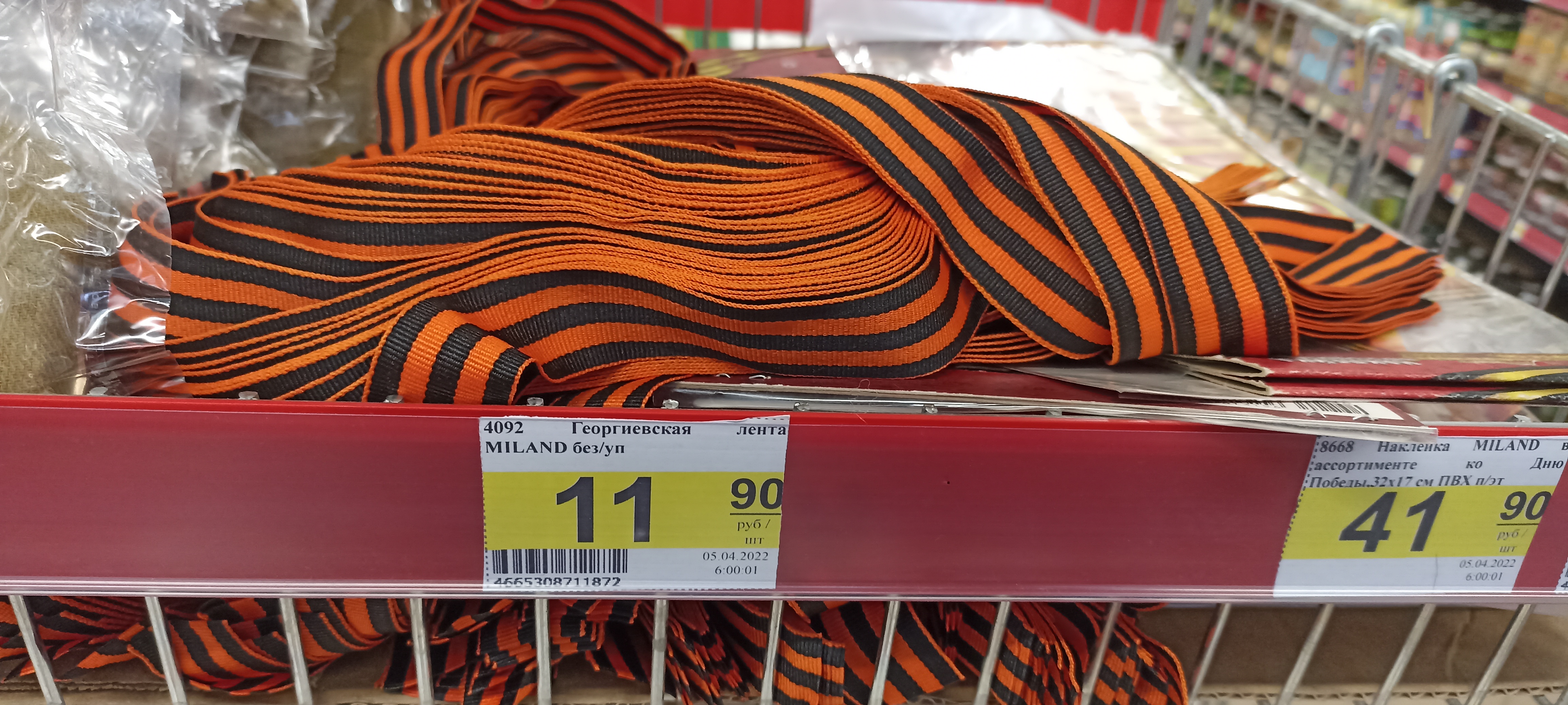 - Георгиевская лента, совпадающая по цветам с лентой учреждённого Екатериной II Георгиевского креста и советской Гвардейской медальной лентой времён Второй мировой, в современной России используется как символ Дня победы, а с 2022-го — поддержки войны против Украины.