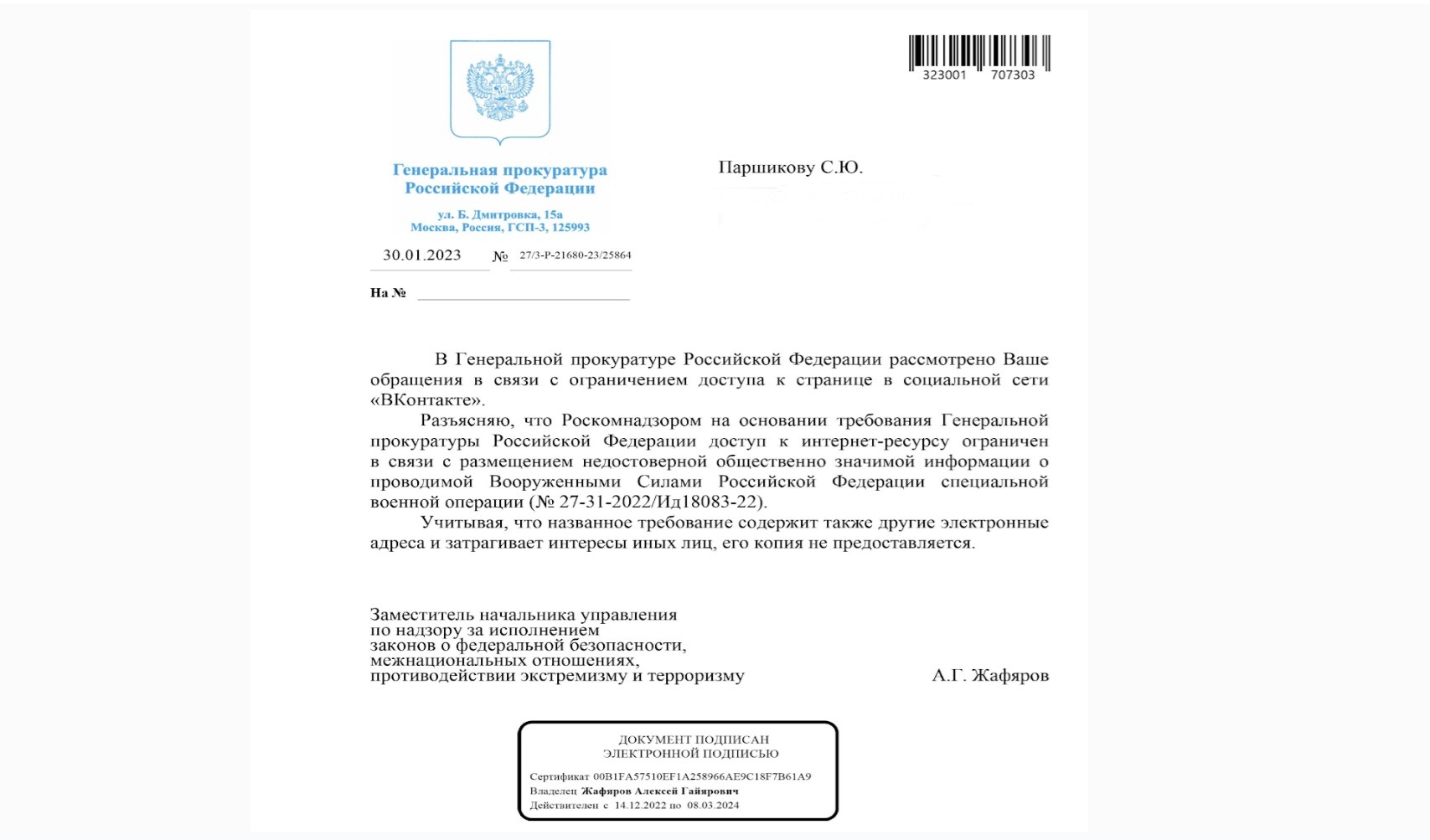 Чтобы придать огласке имена таких "юристов" и отделы, где они работают, Паршиков направил письма с риторическим вопросом о причинах блокировки своей группы в Роскомнадзор и Генпрокуратуру. Ответ пришел от управления Генпрокуратуры с длинным названием: по надзору за исполнением законов о федеральной безопасности, межнациональных отношениях, противодействии экстремизму и терроризму с подписью замначальника управления Алексея Жафярова.