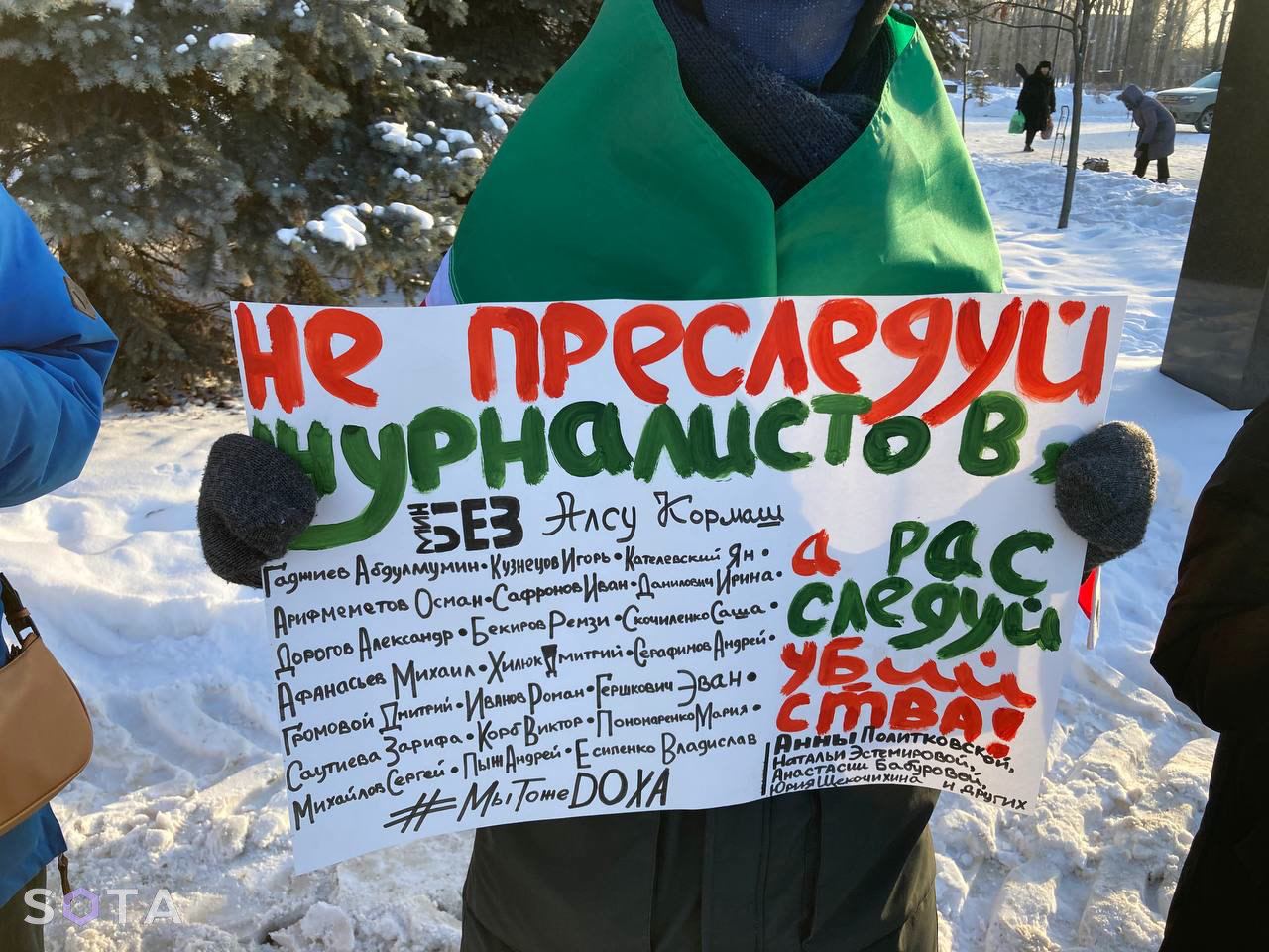 UPD: Через несколько минут после начала акции силовики заставили убрать плакаты двух участников пикета за свободу журналистики с упоминанием Алсу Курмашевой. Об этом сообщает корреспондент SOTA. Как пишет издание, их посчитали "не соответствующим тематики митинга".