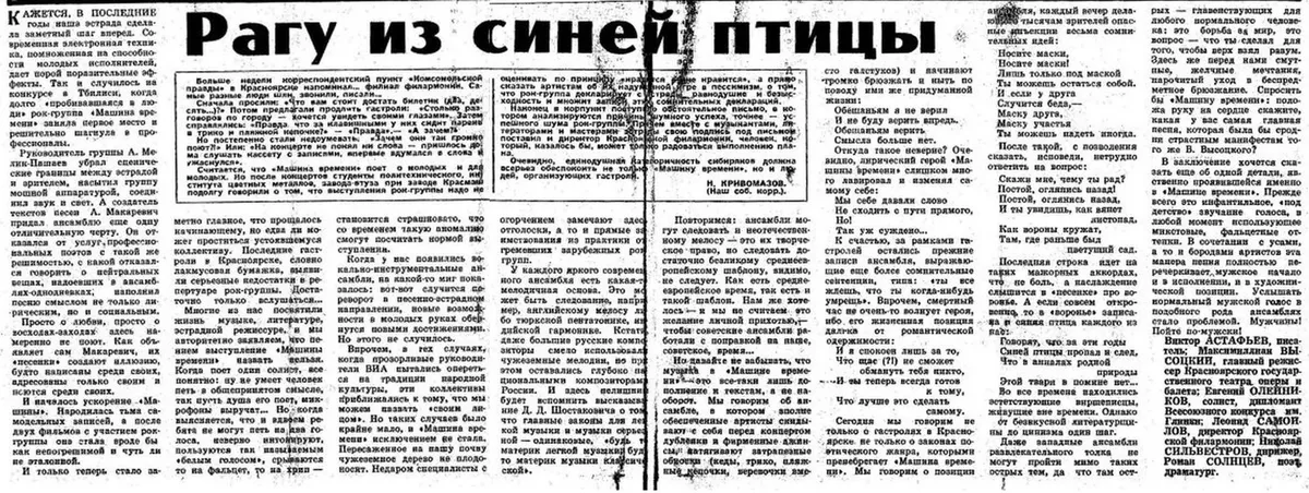 «…Мы говорим о позиции ансамбля, каждый вечер делающего тысячам зрителей опасные инъекции весьма сомнительных идей», — через полмесяца в «Комсомолке» вышел разгромный подвал «Рагу из синей птицы» о красноярских концертах; понятно, что читался он лишь как доказательство, что «Машина» — это настоящее и это поистине наше. Ну раз на музыкантов так окрысились. А что там, под этой коллективной рецензией, еще и подпись большого писателя Астафьева — так что? Кому еще подписывать такое? «Народ и партия едины» — зря, что ли, пишут трехметровыми буквами повсюду? (Этот размер букв и эта повсеместность лозунга — для чего? От неуверенности в себе или от забывчивости?) Вот он как раз от народа. «Людочку» и «Пролетного гуся» Астафьев еще не написал, а они не прочитали. Он еще напишет, а они прочтут.