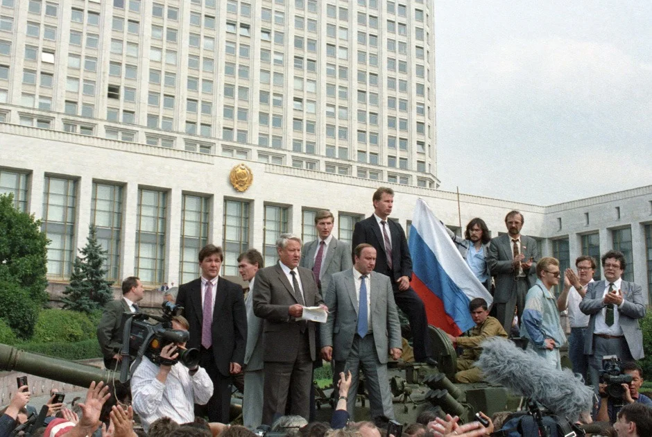 Комсомольская школа — все-таки великая вещь, смотришь на Серегу и готов действительно идти в бой, «Это наша с тобою земля, / Это наша с тобой биография». Записывают Серого еще утром 19-го числа, кассету отправили в Москву самолетом, который летит почти вровень с наступающим днем, и когда Российский телеканал, несмотря на запрет, подпольно ночью выходит с 35-минутным выпуском новостей на «Орбиты», на Дальний Восток, Сибирь, Урал, то кадры с Ельциным на танке (там, кстати, выше всех забрался Золотов, будущий усмиритель фронды и полководец) не просто соседствуют с Серым на берегу, Ельцин идет следом за ним, фотогеничный комсомолец-блондин — первый.