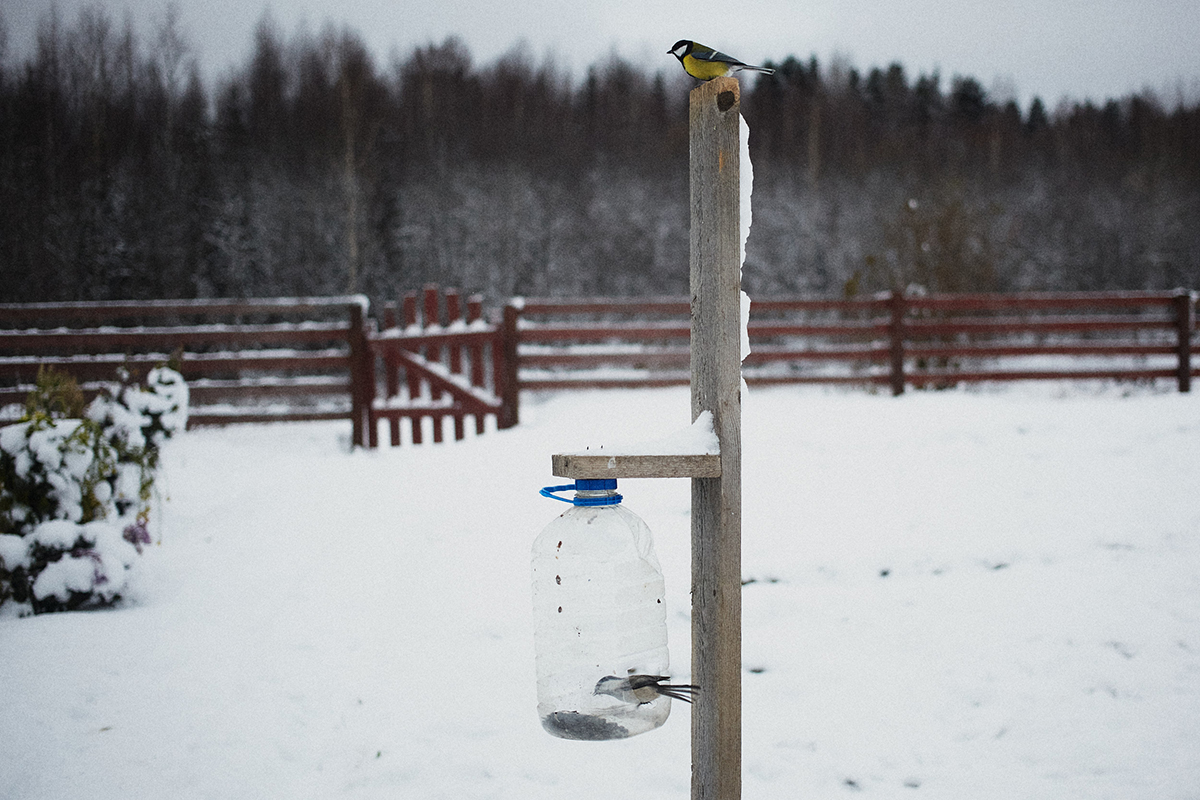 Кормушка для синиц у местного жителя во двореФото: Лиза Жакова для ТД «Во время метели или сильных дождей усилители перестают работать, — рассказывает Ирина. — Четыре дня осенью ливни шпарили, так мы были отрезаны от мира. Я договаривалась с соседом, у которого есть машина, и мы выезжали за пять километров в город. Чтобы хотя бы позвонить дочке, узнать, как у нее дела, да и самой рассказать, седьмой десяток — это ведь немало». Для того чтобы в случае чего вызвать скорую помощь, пенсионерке приходится идти до автобусной остановки — там получается совершить экстренный звонок на 112.