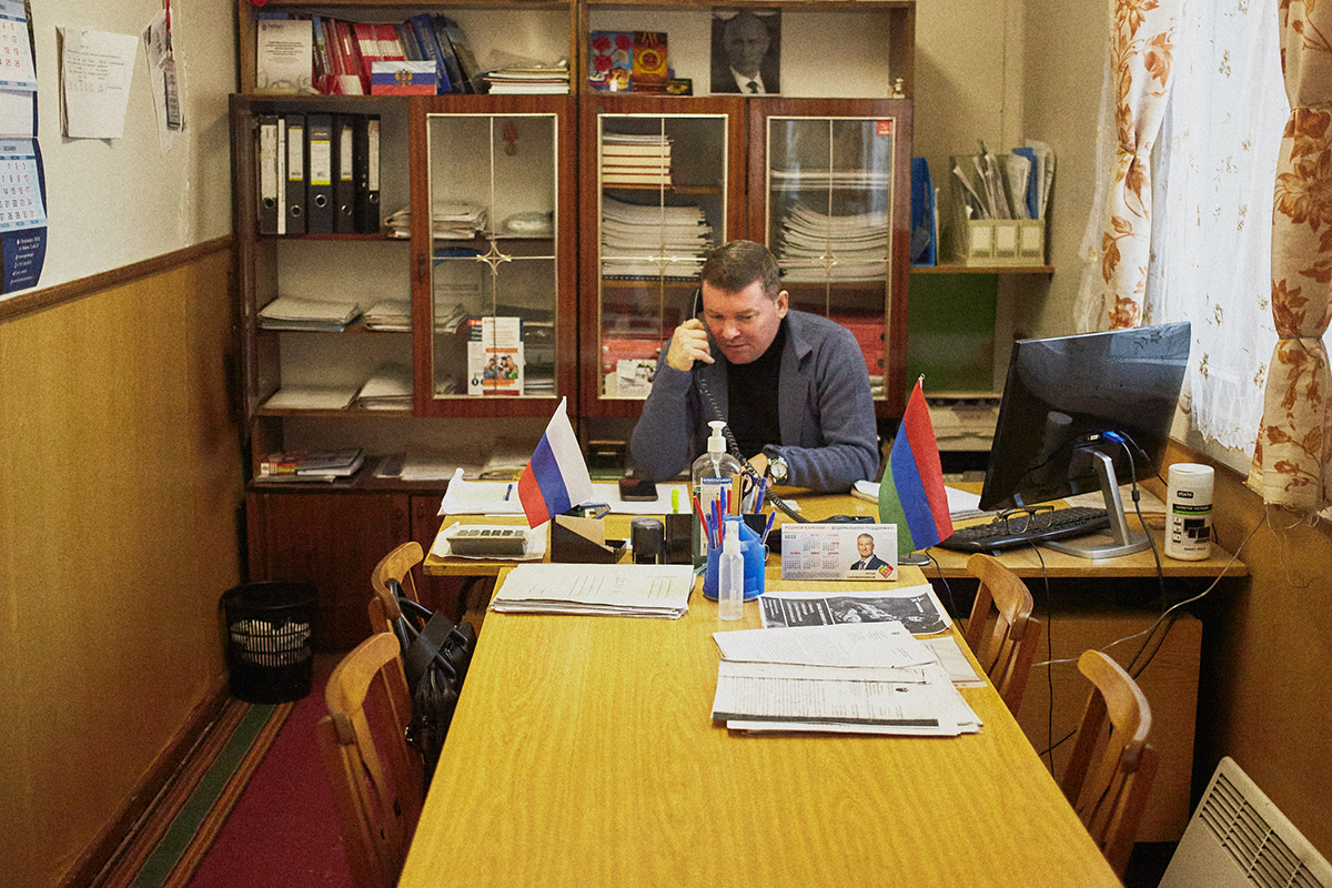 В селеФото: Лиза Жакова для ТД Здание администрации находится в поселке Кривцы в 36 километрах от Приречного. В кабинете у Карпова на столе стоят маленькие флаги — российский и карельский. На стенах — цветные календари с изображением губернатора региона Артура Парфенчикова, а на полке — прислоненный к задней поверхности листок А4 с распечатанной на принтере черно-белой фотографией президента России. В правом углу стеклянной дверцы шкафа, который ломится от всевозможных бумаг и папок, виднеется небольшая красная наклейка КПРФ.