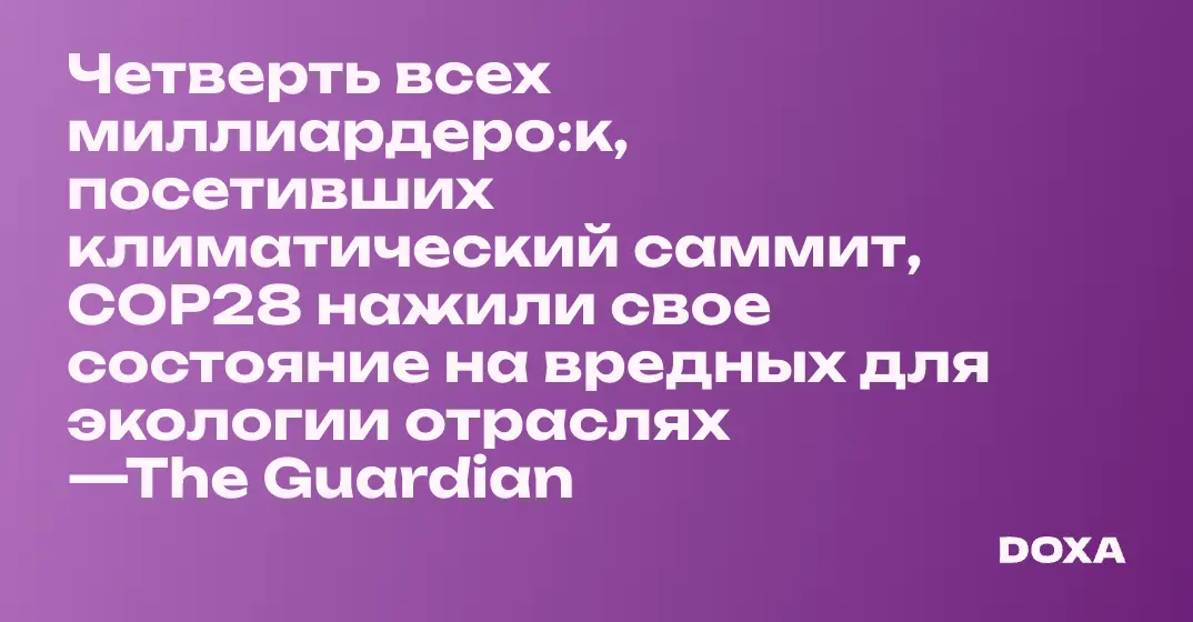 Исследование The Guardian выявило, что четверть миллиардеро:к-делегато:к климатического саммита COP28 накопили свое богатство в высокозагрязняющих секторах, таких как нефтехимия и горнодобыча. В их числе и российские олигархи. Общее состояние всех 34 миллиардеро:к, посетивших саммит, — 495 миллиардов долларов.