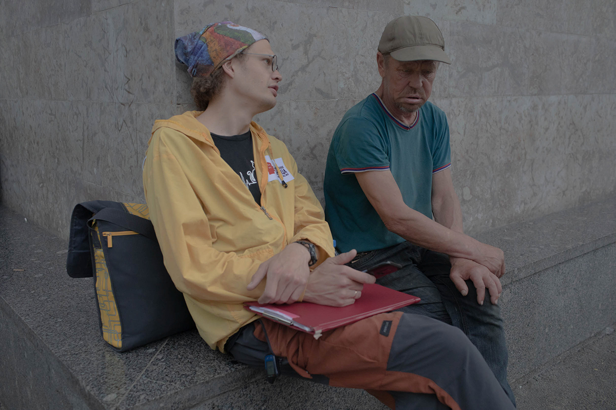 Врач Сергей Иевков объясняет бездомному мужчине этапы восстановления документов. Санкт-Петербург