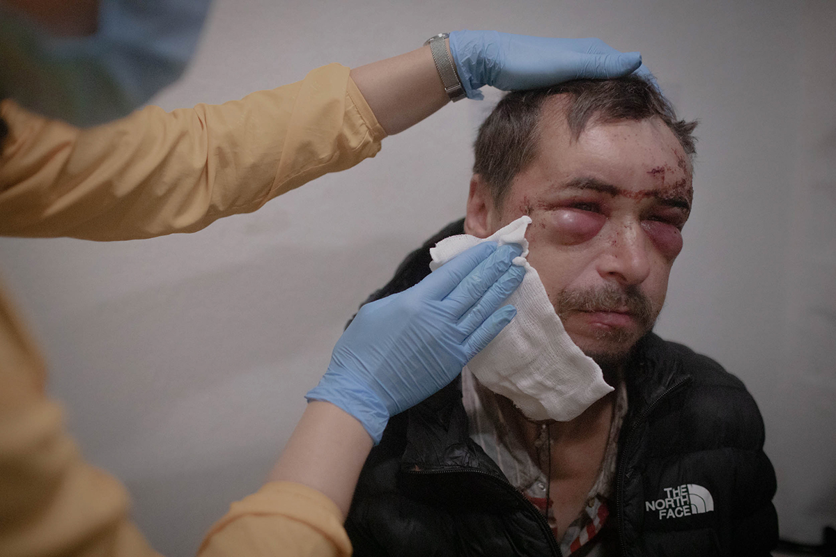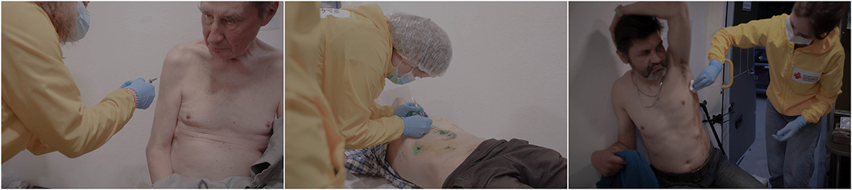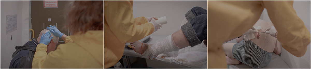 Слева: врач меняет повязку пациенту после травмы головы. Санкт-Петербург. В центре: перевязка трофической язвы. Среди пациентов «Благотворительной больницы» есть те, у кого был опыт употребления психоактивных веществ. Одно из последствий — трофические язвы. Они долго заживают и требуют постоянных перевязок. Стоянка у ночного приюта у железнодорожной станции Обухово, Санкт-Петербург. Справа: врач Сергей Иевков удаляет струп со спины пациента. Со слов мужчины, он недавно освободился из мест лишения свободы и не может вернуться к обычной жизни. Санкт-Петербург