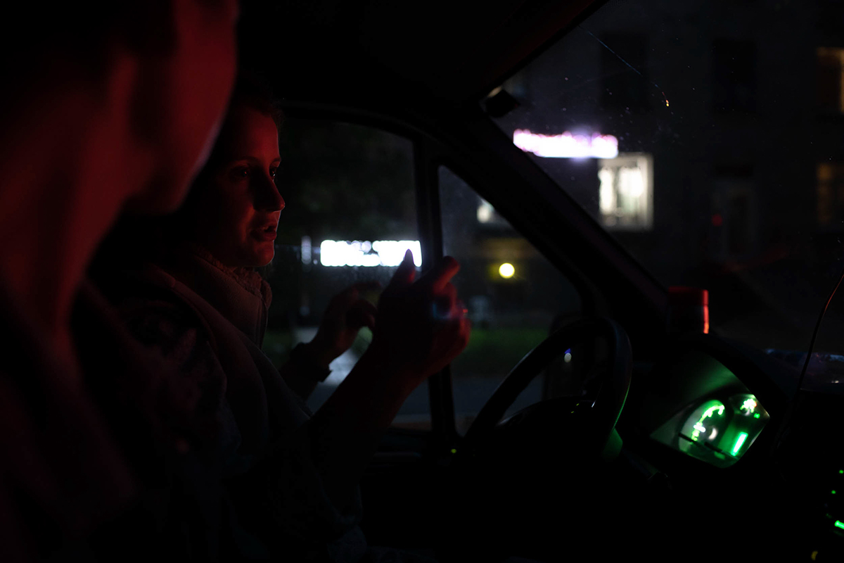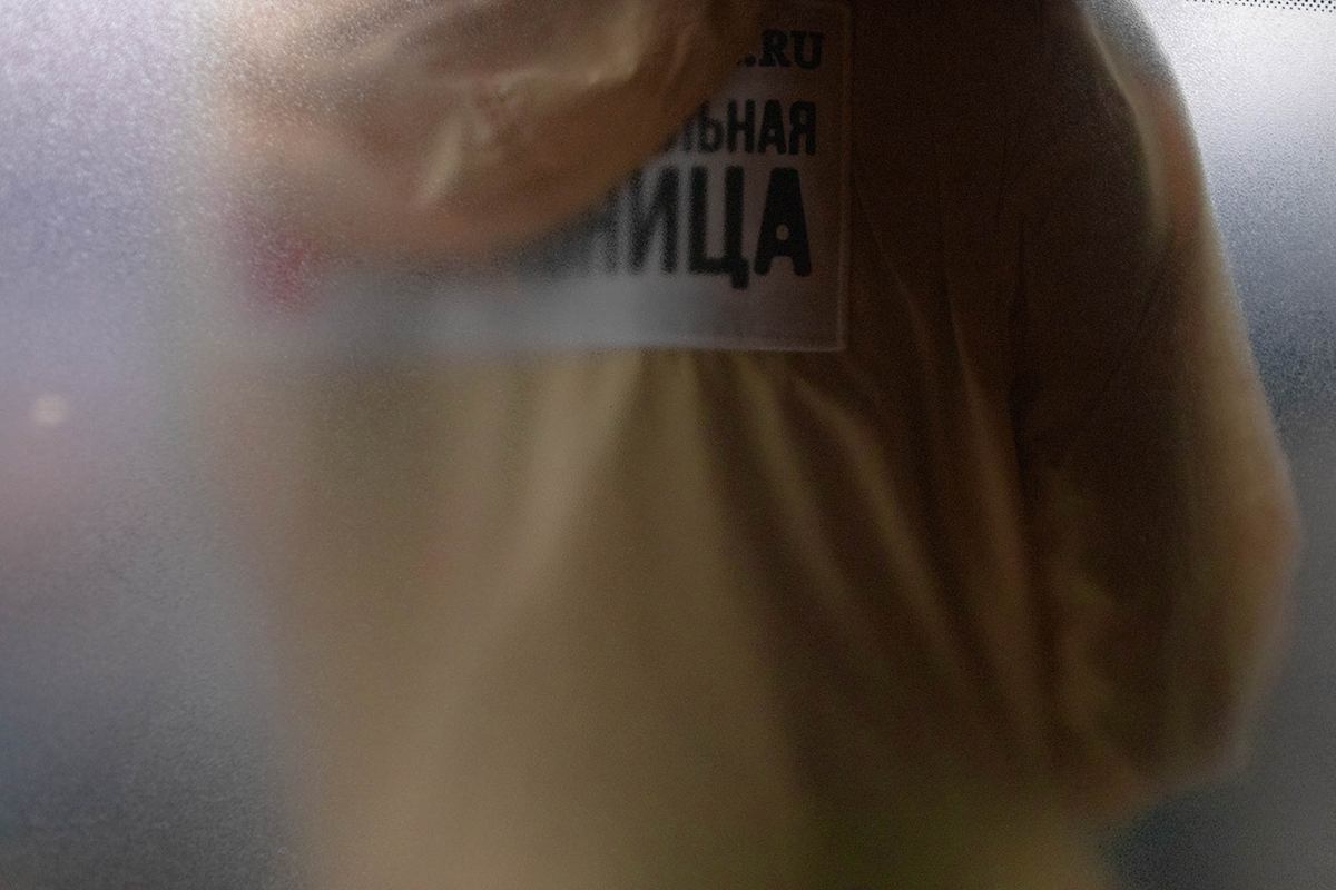 Врач Ника Булавинова в машине скорой помощи провожает пациента на госпитализацию. Санкт-Петербург
