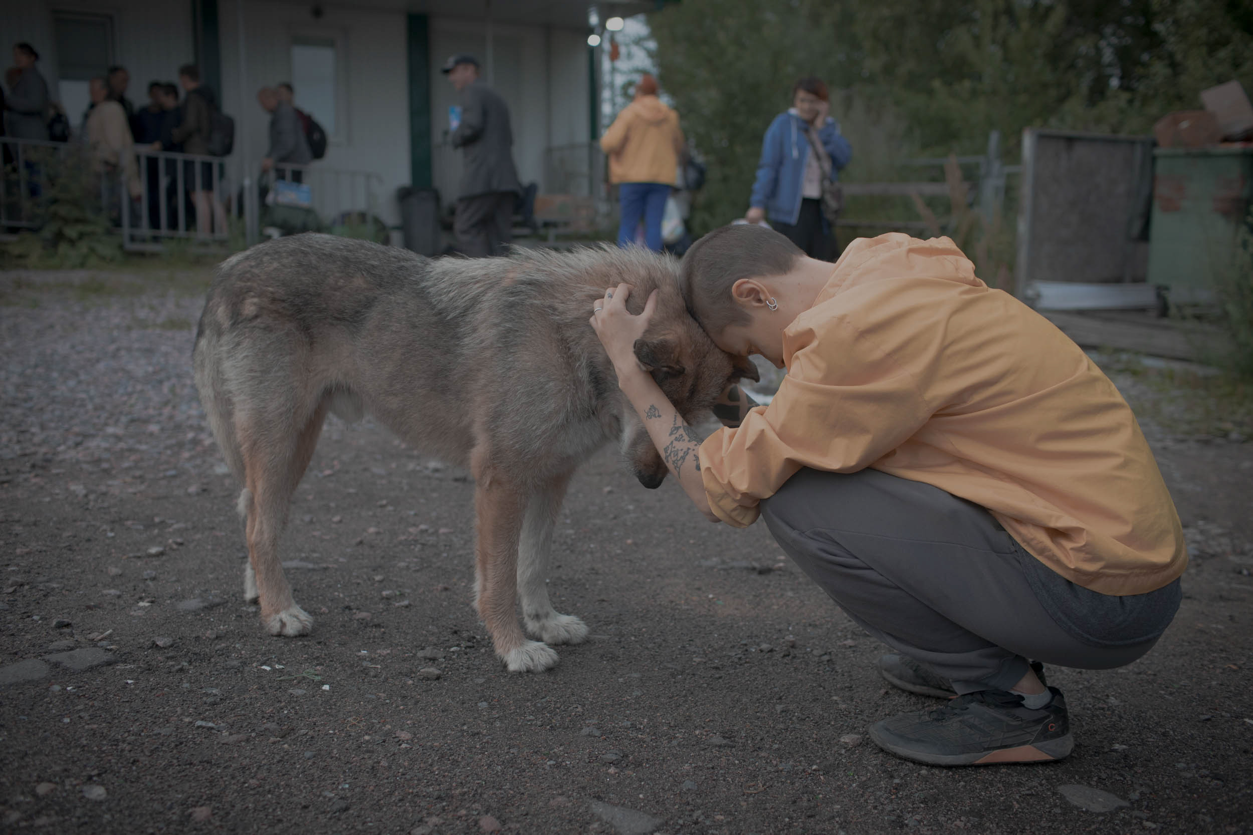 Ночной приют у железнодорожной станции Обухово. Сотрудник «Ночлежки» обнимает собаку. На заднем плане очередь: все хотят успеть заселиться в приют. Санкт-Петербург