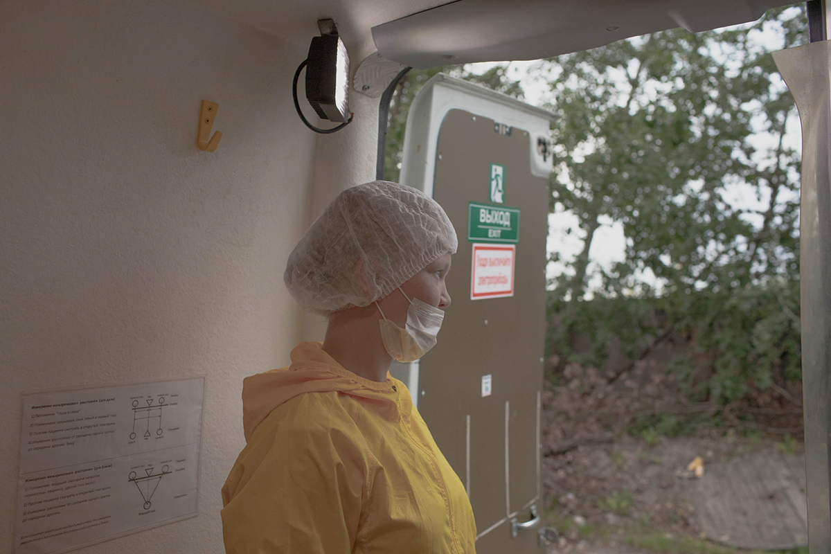 Врач Ника Булавинова за рулем автобуса мобильной клиники. Санкт-Петербург