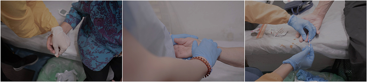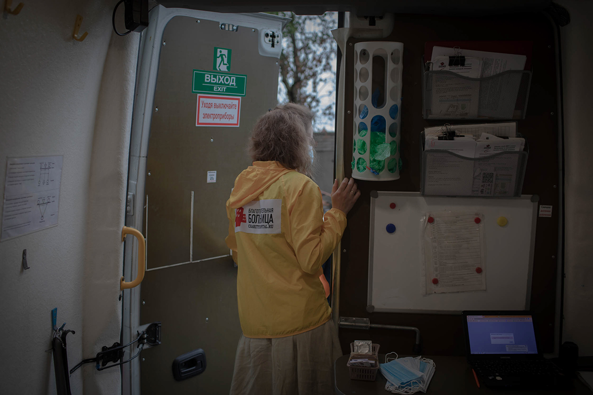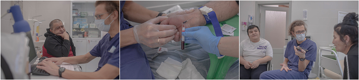 Слева: врач Сергей Иевков ведет прием в медицинском кабинете. Этот кабинет назван в честь голландского врача Франца Ван-дер-Флааса, который в 1850 году открыл в Петербурге Максимилиановскую больницу. До середины XIX века не каждый житель города мог обратиться за медицинской помощью к частным врачам. В больницу такие пациенты попадали уже с тяжелыми заболеваниями и травмами, часто теряя при этом работу. 29-летнему медику Ван-дер-Флаасу пришла идея о создании лечебницы, где можно было бы бесплатно получать медицинскую помощь. Вар-дер-Флаас сумел привлечь к работе самых выдающихся врачей того времени, которые консультировали пациентов безвозмездно. Расписания приемов печатали в газете «Русский инвалид». В 1851 году лечебницу посетили 25 245 человек. Санкт-Петербург. В центре: забор крови у пациента. В условиях микроавтобуса было невозможно взять у пациента кровь для подтверждения диагноза, если один из экспресс-тестов давал положительный результат. В условиях клиники это стало возможным, и сегодня кровь отправится на повторный анализ. Санкт-Петербург. Справа: врач Сергей Иевков консультирует семью с помощью переводчика. Семья обратилась за консультацией после травмы позвоночника. «Благотворительная клиника» оснащена всем необходимым для приема пациентов с инвалидностью: пандусом, широким дверным проемом, также оборудован туалет. Санкт-Петербург