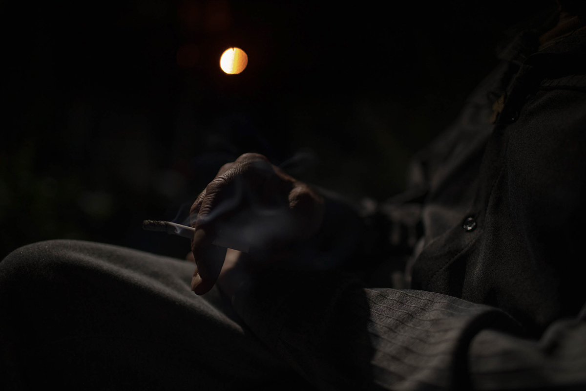 Мужчина курит во дворе ночного приюта. Санкт-Петербург