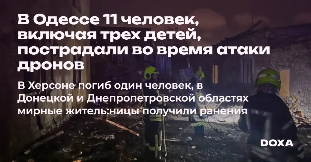 В Одесской области второй день подряд атаковали областной центр, в результате чего пострадали 11 человек, в том числе три ребенка. Детей и двоих взрослых госпитализировали. В результате падения обломков дронов на общежитие два восьмилетних мальчика и двенадцатилетняя девочка получили контузию и закрытые черепно-мозговые травмы, а взрослые — сотрясение мозга и ранения.