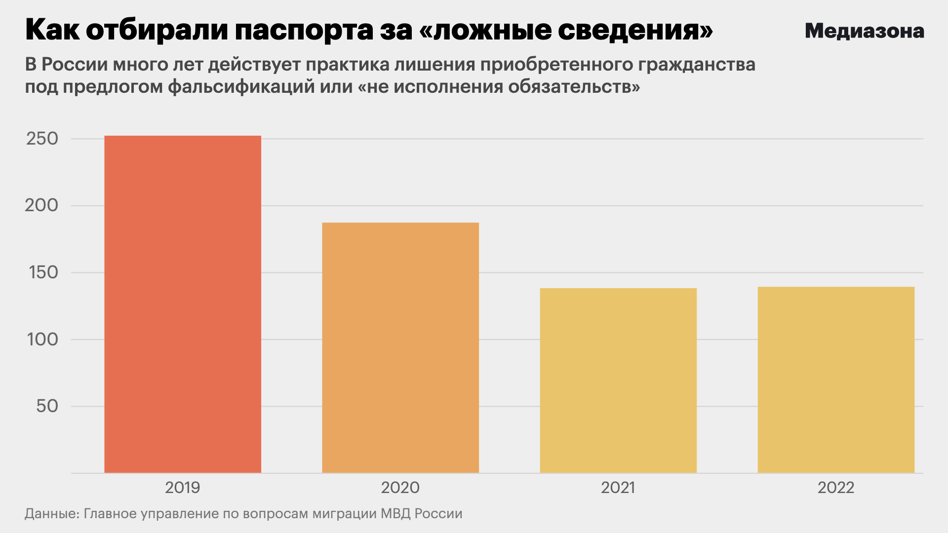 В 2019-2022 годах, по данным МВД, которые проанализировала «Медиазона», гражданства за преступления был лишен 101 человек.