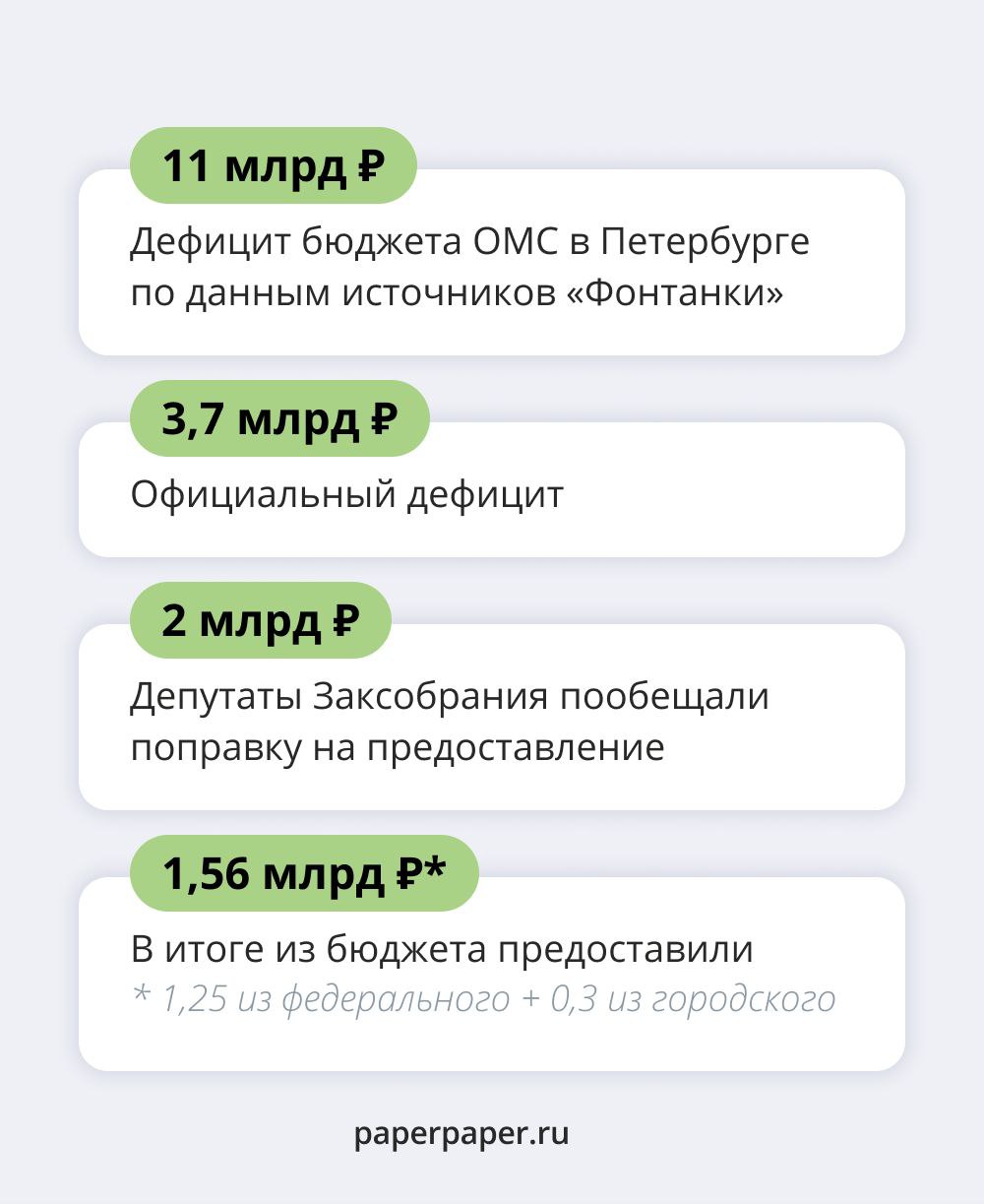 Если верить источникам «Фонтанки», то даже запрошенная депутатом сумма была существенно меньше необходимой — к середине ноября дефицит финансирования по системе ОМС составил уже 11 миллиардов рублей.