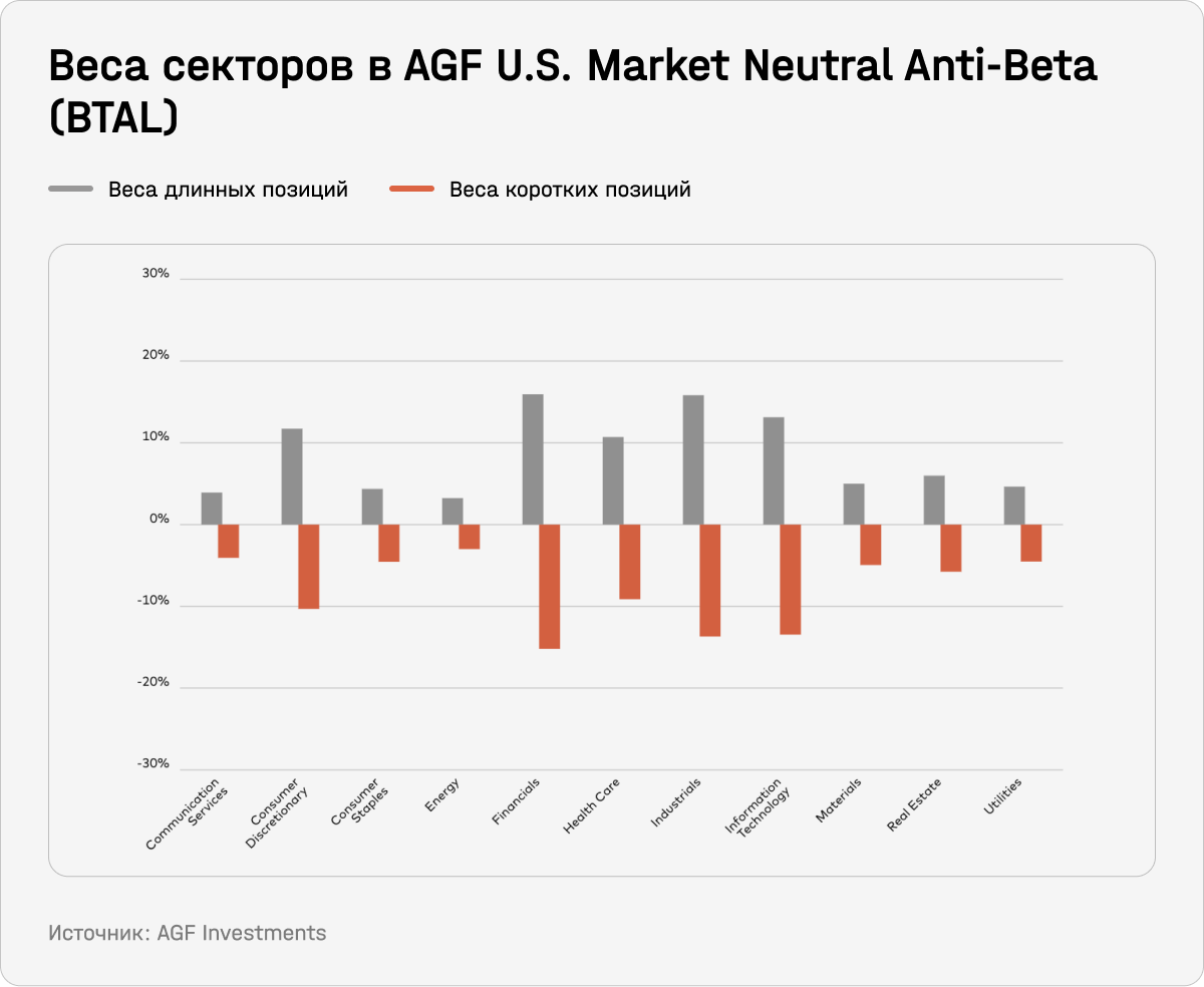 По данным аналитического агентства Morningstar, BTAL — единственный фонд, который можно отнести к категории equity market-neutral. Это может быть связано с тем, что, в отличие от других ETF, он открывает длинные/короткие позиции примерно в равных пропорциях по каждому сектору американского рынка.