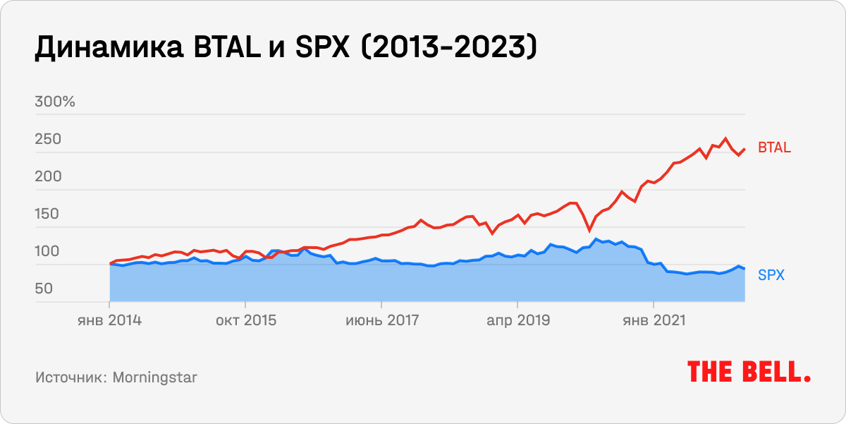 За последние почти 10 лет фонд фактически не принес доходности инвесторам: общая доходность с начала 2014 года составила +1,41%. Зато BTAL оказался заметно менее волатильным, чем рынок в целом. Например, в 2022 году S&P 500 из-за опасений по поводу роста ставок снижался, а BTAL торговался фактически на одном уровне и даже прибавил с начала года. Также, весной 2020-го, когда на рынки обрушился «черный лебедь» в виде пандемии, BTAL оставался стабильным.