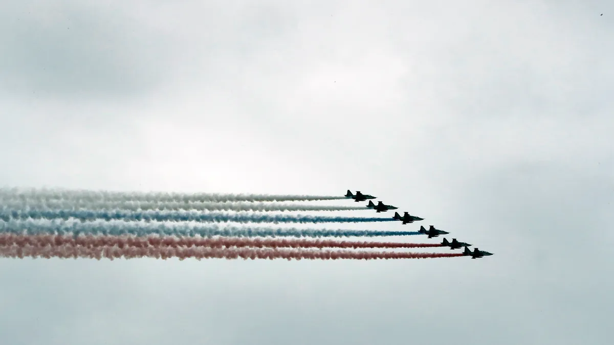 Fighter jets fly over St. Petersburg to mark the 325th anniversary of Peter the Great's founding of the Russian Navy. Photo: EPA-EFE / ANATOLY MALTSEV