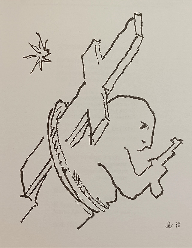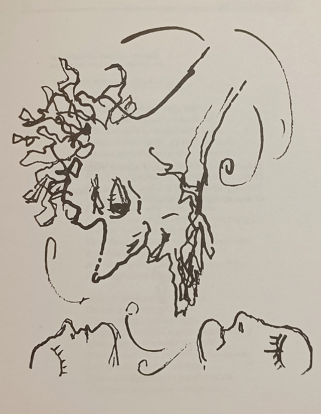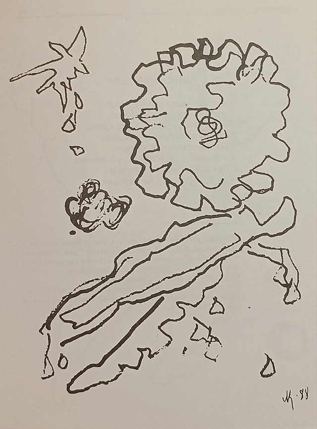 Ил. к описанию 3 («П заглавное с плюмажем…»)Третье описание относится к черновику эротического содержания. Для мужского достоинства, которое Пушкин уподобляет змию, Сапгир находит игровое (бильярдный кий) и военное сравнения (хан Батый). Если вспомнить, что и со змием (драконом) тоже можно сражаться, не вызывает удивления, почему описание построено как батальная сцена: «Весь кипит, как поле битвы, / И дымится черновик...». У Сапгира в авторском послесловии это становится в том числе метафорой пушкинской скорописи и постоянных зачеркиваний («Черновики порой похожи на дымящееся поле битвы... Быстро-быстро перо чертит подряд все близкие эпитеты»). Но основное значение все-таки перевешивает: настоящие баталии обычно заканчиваются победой или смертью, любовные схватки не исключение.