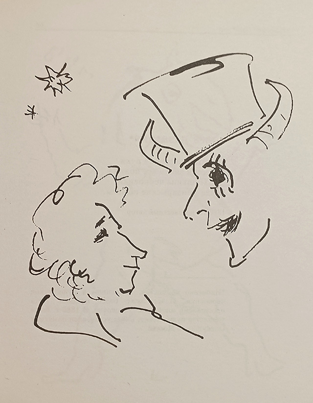 Все верно, но вообще-то стихотворное описание черновика вместо прозаического прежде всего указывает на его заведомую ненадежность. Даже в прозе описания сомнительны, в силу чего при них обычно публикуются факсимильно-транскрипционные представления (ФТП). «Черновики Пушкина» Сапгира легко можно было бы сопроводить в приложениях или комментариях такими ФТП. Ни сам автор, ни публикаторы на такое не пошли, возможно сочтя столь громоздкое научное сопровождение художественного текста неуместным. Но тем более отчетливо следует понимать всю условность стихотворных описаний черновиков, которые в первой редакции вместо ФТП сопровождаются рисунками Льва Кропивницкого, тоже весьма условными. Там, например, где говорится о пяти повешенных декабристах, художник изображает одного человека с револьвером (!) в руке и привязанным к спине крестом. Содействует ли это «более глубокому пониманию незавершенного» замысла, большой вопрос.