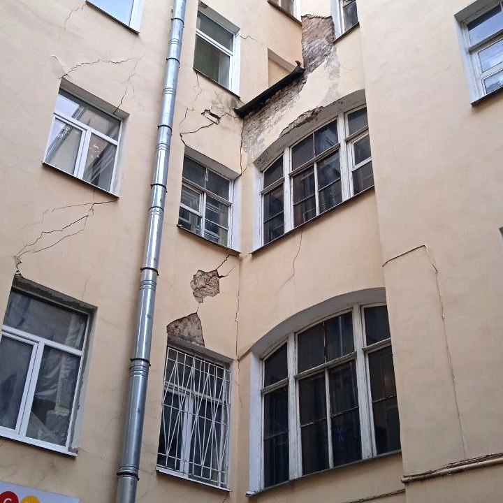 На портале «Наш Санкт-Петербург» зарегистрировано три жалобы на неудовлетворительное состояние парадной и фасада, обнаружила «Бумага». Жительница последнего этажа четвертого подъезда Екатерина в марте 2022 года рассказала, что еще в 2020-м с соседями жаловалась в управляющую компанию «ЖКС Адмиралтейского района» на трещины в парадной, а также в квартирах. Трещины шли по стенам, полу и потолкам.