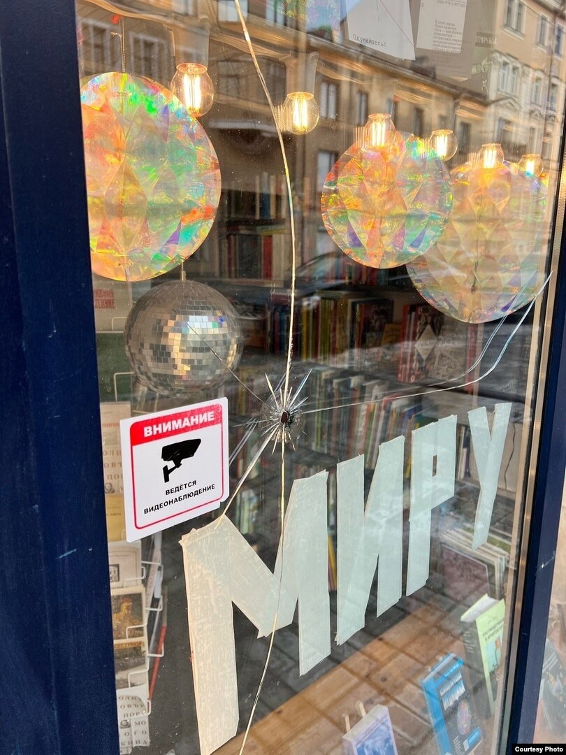 В самом начале войны сотрудники книжного нанесли на витрину лозунг "Миру – мир!". В марте витрину выстрелом, предположительно, из пневматического или травматического пистолета повредил неизвестный. После этого на стекле осталась только надпись "Мир". На днях к ней добавили буквы "Zа". Кто это сделал, работники магазина не знают.