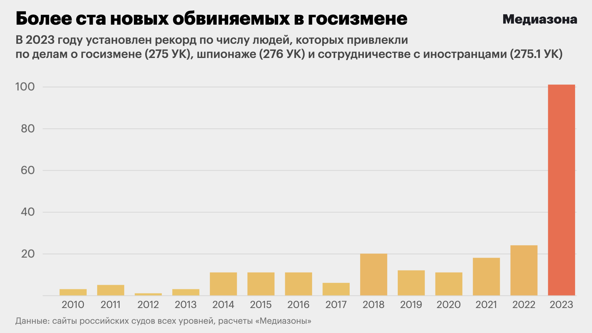 За 2023 год в России как минимум 101 человек стал фигурантом уголовных дел по статьям о госизмене (275 УК), шпионаже (276 УК) и сотрудничестве с иностранными государствами или организациями (275.1 УК), выяснила «Медиазона», изучив все опубликованные судами материалы по таким делам.