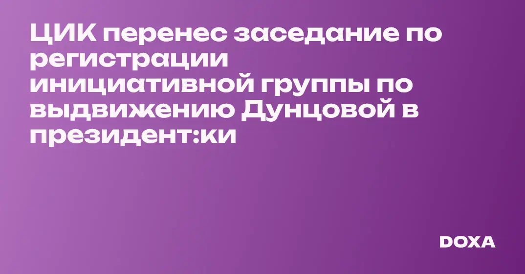 Центральная избирательная комиссия перенесла заседание по поводу регистрации инициативной группы избиратель:ниц, выдвигающих Екатерину Дунцову в президент:ки. Об этом политикесса сообщила в своем телеграм-канале. В случае отказа у Дунцовой не будет времени провести повторное собрание, необходимое для выдвижения.