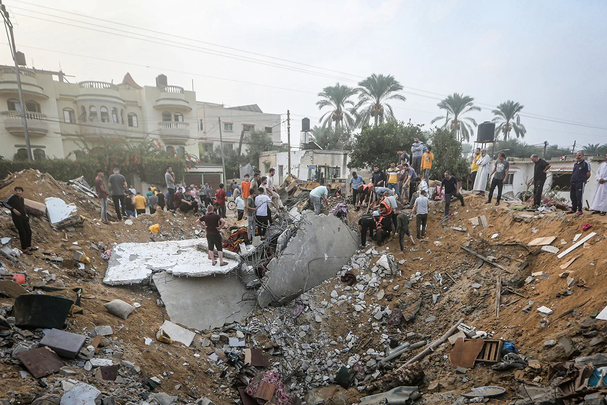 Палестинцы стоят у воронки, образовавшейся в результате израильского удара в Хан-Юнисе на юге сектора Газа, 24 октября 2023. Фото: Ahmed Zakot / SOPA Images / LightRocket / Getty Images
