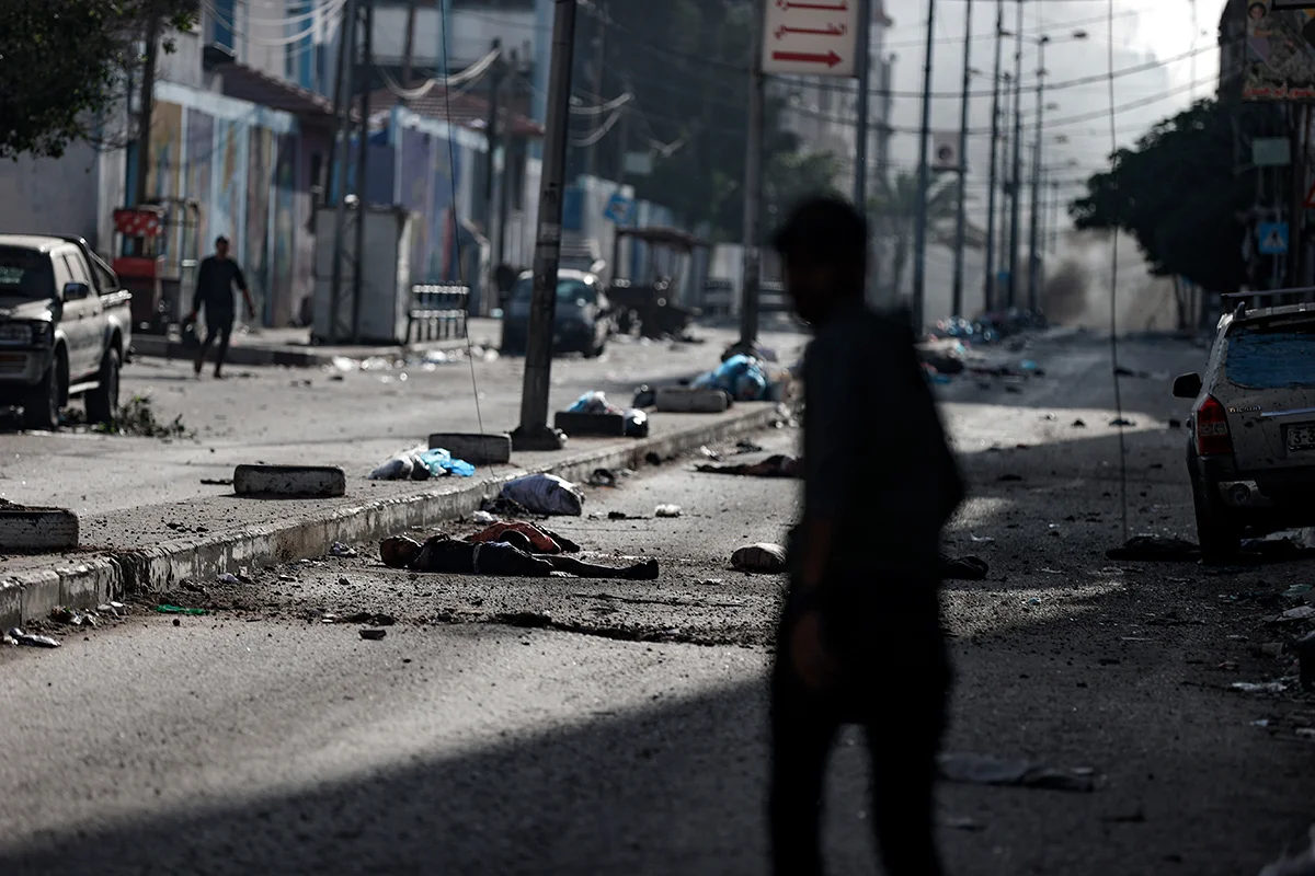 Мертвые тела на улице рядом с больницей Аш-Шифа в городе Газа, 9 ноября 2023 года. Фото: Ali Jadallah / Anadolu / Getty Images