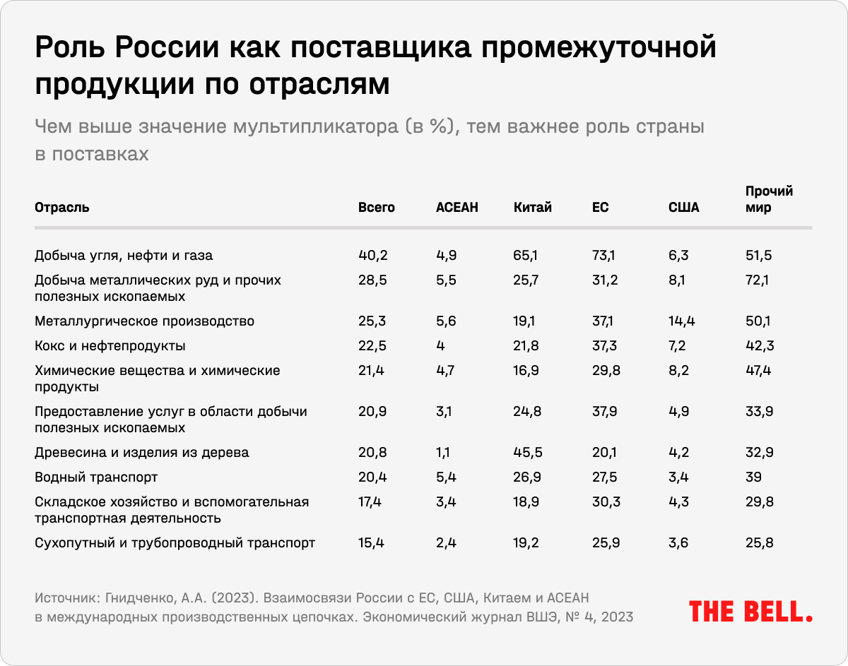 На основе данных ОЭСР Гнидченко рассчитал значения, отражающие зависимость России от промежуточной продукции и ее значимость как поставщика промежуточной продукции для других стран. Речь идет о мультипликаторах добавленной стоимости, которые показывают, как сократится производство (в центах или процентах на доллар) при снижении добавленной стоимости промежуточных товаров на $1. Добавленная стоимость промежуточных товаров — стоимость, которую производитель добавляет к себестоимости их производства.