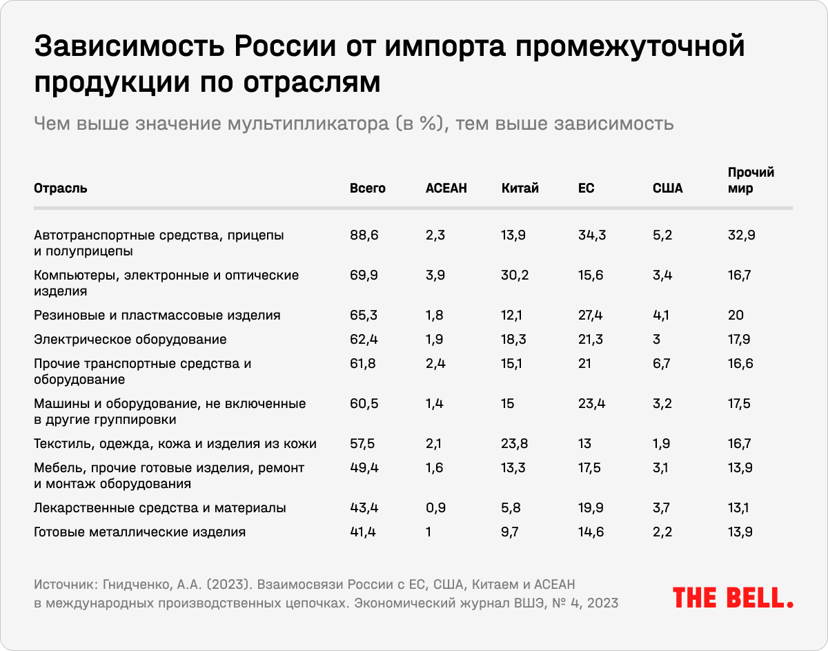 Россия, в первую очередь, зависит от промежуточной продукции для выпуска автомобилей, прочих транспортных средств, компьютеров, электроники, оптики, резиновых и пластмассовых изделий, электрического оборудования, легкой промышленности, мебели, лекарств и готовых металлических изделий, показал анализ.