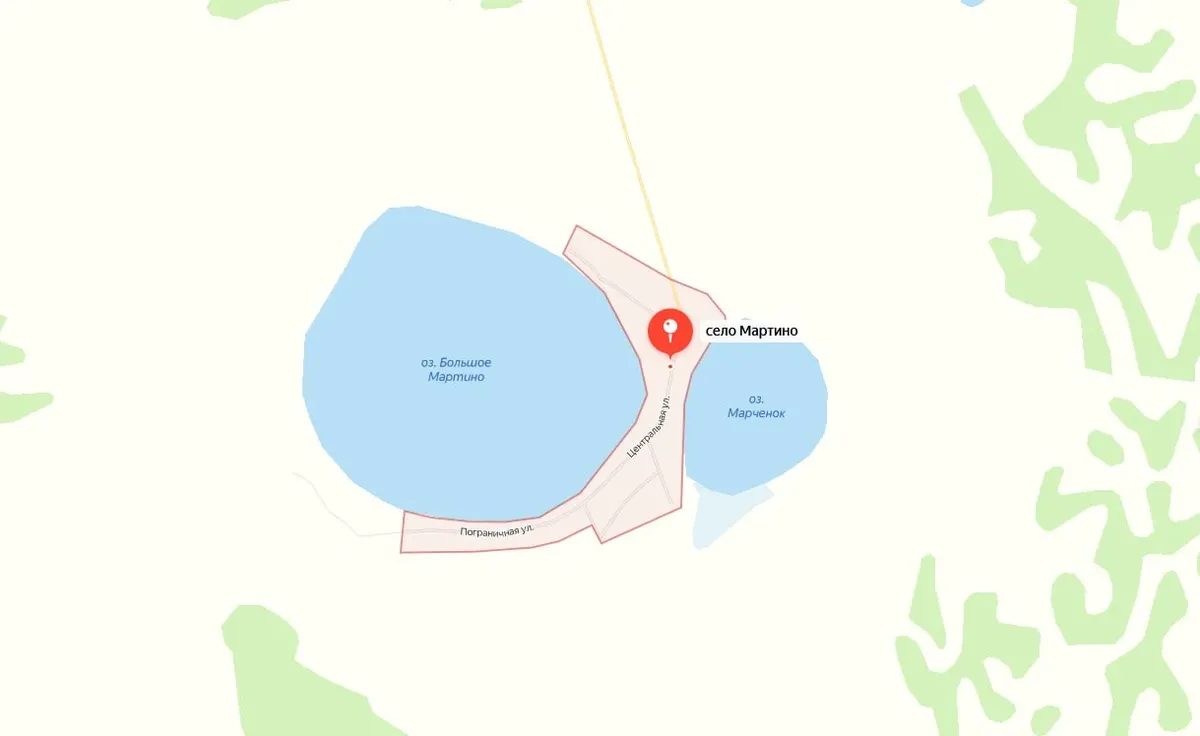 Вскоре за очередным поворотом на горизонте показывается крупная деревня. На въезде — щит в цветах российского флага: «Село Мартино основано в 1804 году». На уголке — летящий белый голубь мира. Рядом — пустая будка пограничника, больше похожая на сколоченный из досок сарай с выбитыми окнами и качающейся на ветру деревянной дверью.