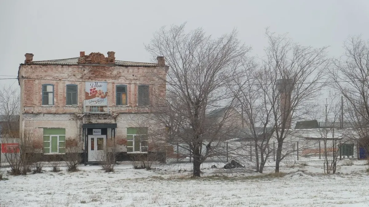 Несмотря на размеры, село производит впечатление абсолютно безлюдного. Кирпичные дома с обвалившимися стенами, огромное здание бывшей школы, такое же холодное и безжизненное, как пейзаж вокруг.