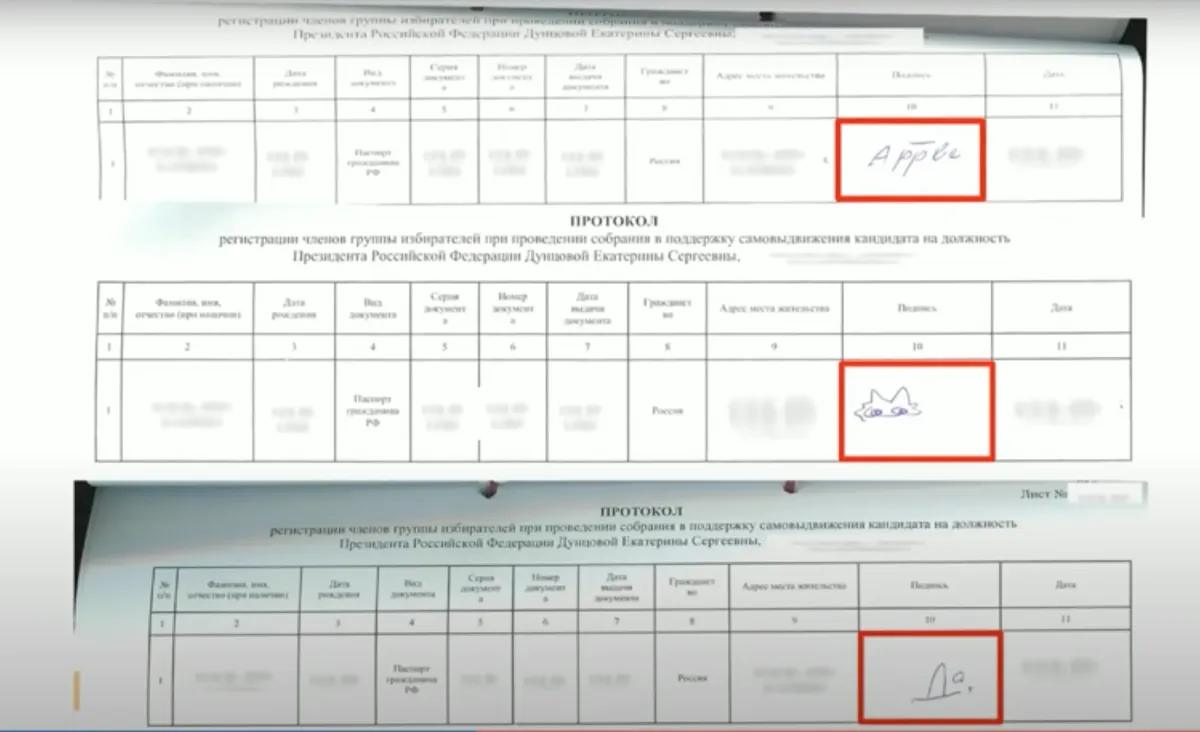 Инициативная группа, согласно закону, должна составить протокол собрания о выдвижении кандидата. Однако в случае с Дунцовой ЦИК считает, что документ изготовлен не во время мероприятия, а после него: из-за этого якобы нельзя подтвердить, что поддержать Дунцову пришло не менее 500 человек.