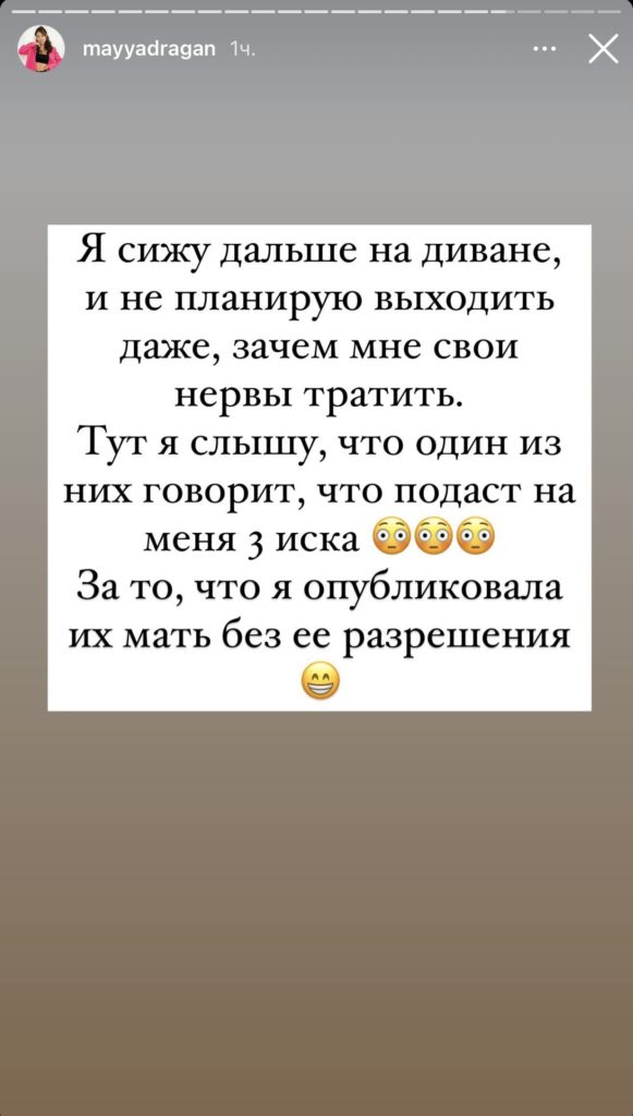 Позднее Драган опубликовала сторис с рассказом о том, что к ней в квартиру пришли соседи, попавшие на видео. По словам блогерки, они угрожали ей тремя судебными исками за то, что она сняла их без разрешения.