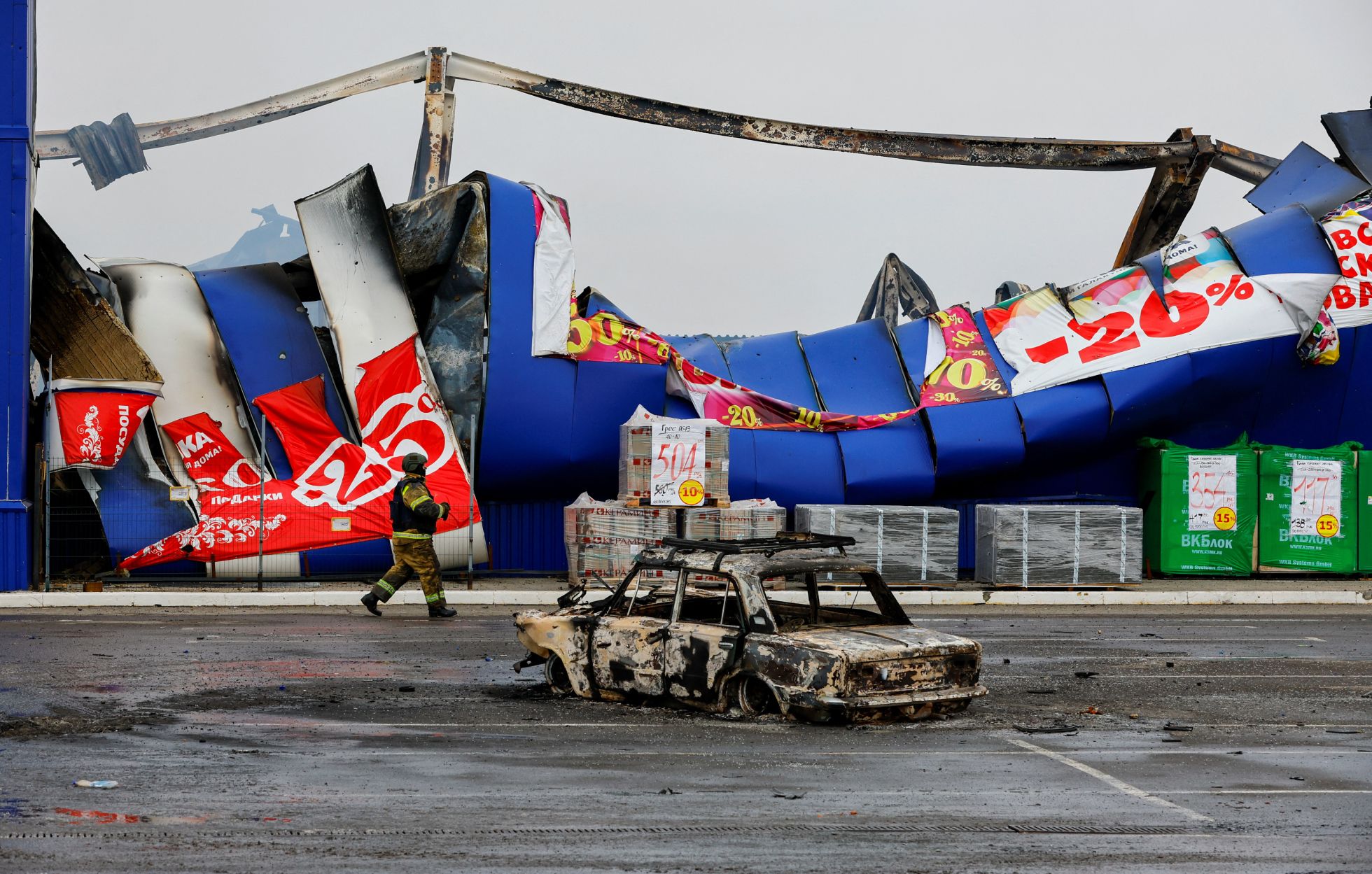 В городе повреждены жилые дома и автомобили, здания школы и художественного музея. Кроме того, после обстрела в местном торговом центре «Галактика» начался сильный пожар.