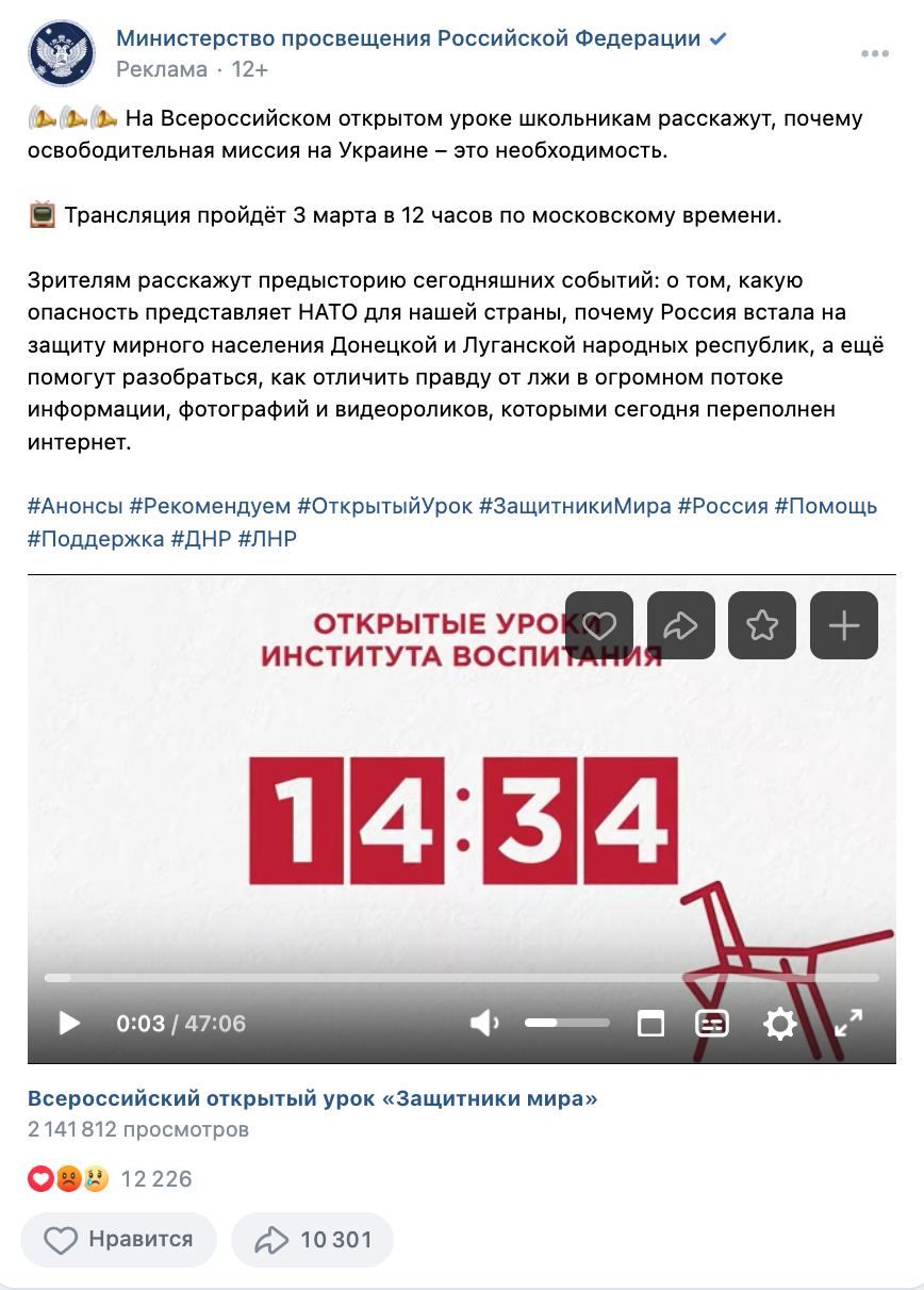 «Команда с 26 этажа» помогает решать разные политические задачи. Например, продвигает посты с открытыми урками, где школьникам объясняют, почему война — необходимость.