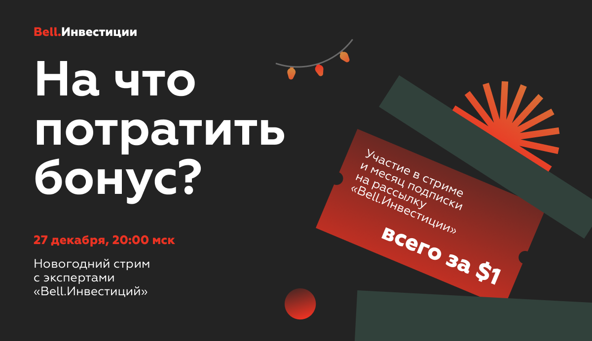 Подписчики рассылки «Bell.Инвестиции» смогут принять участие в стриме бесплатно — мы пришлем вам ссылку заранее. А для остальных наших читателей действует новогоднее спецпредложение — участие в стриме + месяц подписки на «Bell.Инвестиции» — всего за $1.