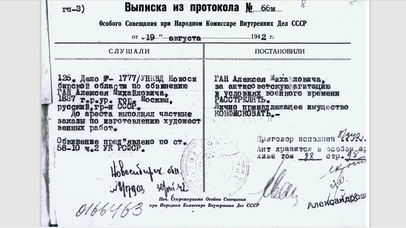 "Выписка" и некоторые другие документы из дела Алексея Гана опубликованы на сайте томского музея "Следственная тюрьма НКВД". Где именно погребены останки Алексея Гана, который был одной из ключевых фигур советского конструктивизма, неизвестно. Как рассказал Сибирь.Реалии Александр Рудницкий, много лет возглавлявший новосибирский "Мемориал", существовало постановление, согласно которому расстрелянных "врагов народа" хоронили тайно, не оставляя на местах погребений никаких следов.