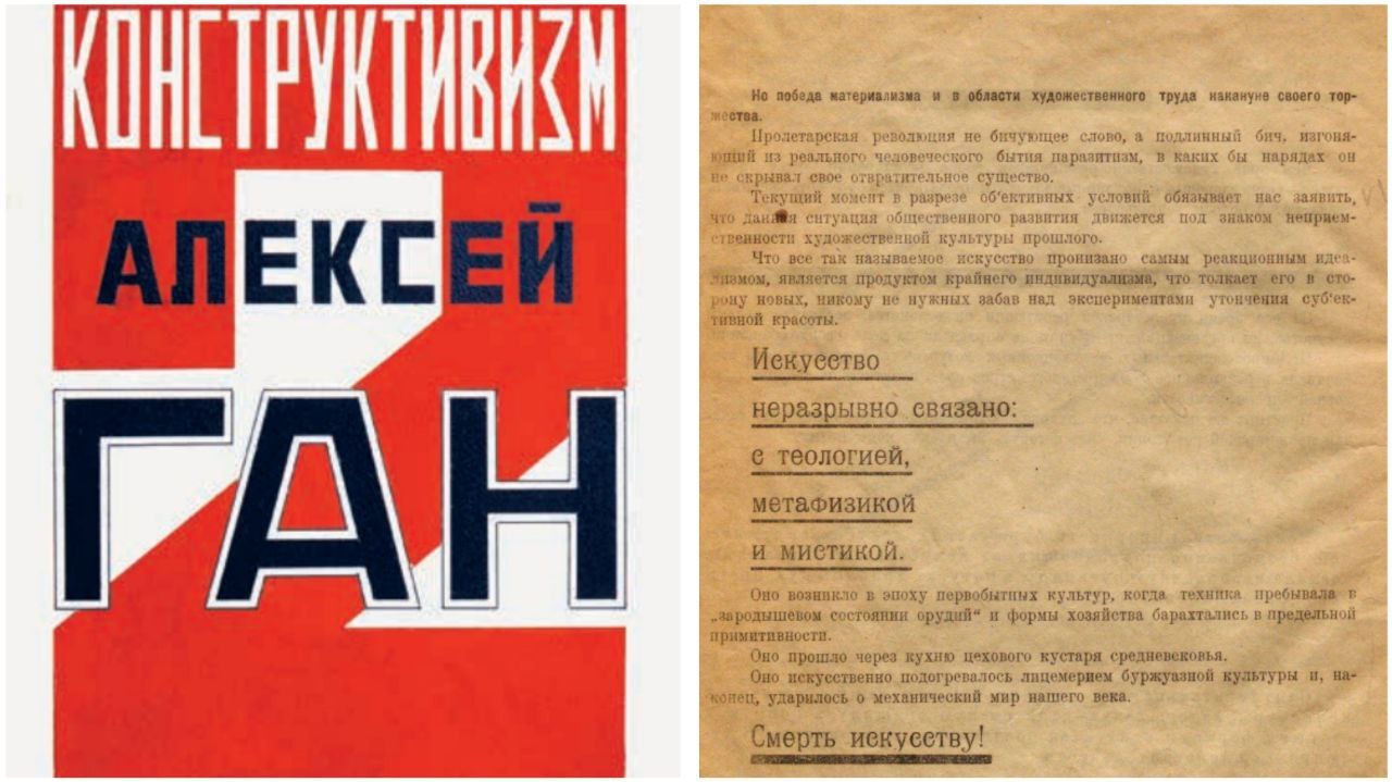 Новаторские решения работы с типографикой отличают и самый известный манифест Гана – "Конструктивизм". Он вышел отдельной брошюрой в 1922 году. Дизайном обложки занимался Александр Родченко. В "Конструктивизме" Ган требует от художников полного разрыва с буржуазным искусством. Само слово "искусство" для него ругательное (в этом он разошёлся со многими коллегами-авангардистами). "Мы объявляем непримиримую войну искусству!" – пишет Ган.
