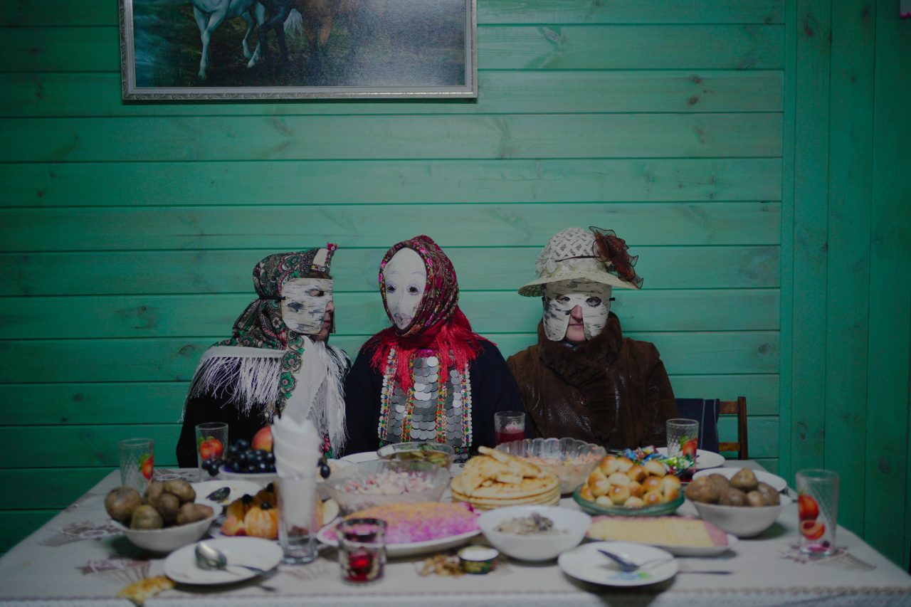 Ряженые в доме одной из жительниц села Шлань Республики Марий Эл на праздновании Шорыкйол, национального Нового года. В деревнях Шоруньжа и Шлань говорят на марийском языке, топят печи, возделывают землю, а по праздникам молятся в священных рощах. Все это сочетается с современной жизнью — магазинами, сотовыми телефонами, интернетом.